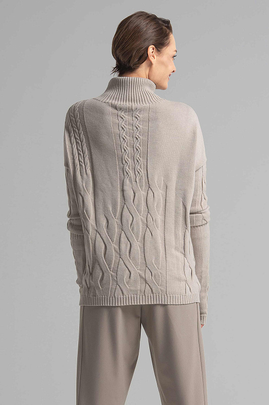 Теплый и мягкий джемпер с ассиметрично расположенным фактурным узором «косы» из нежной вискозы с шерстью мериноса и кашемиром. Свободный джемпер прямого силуэта, спущенная линия плеча, широкий воротник-гольф.