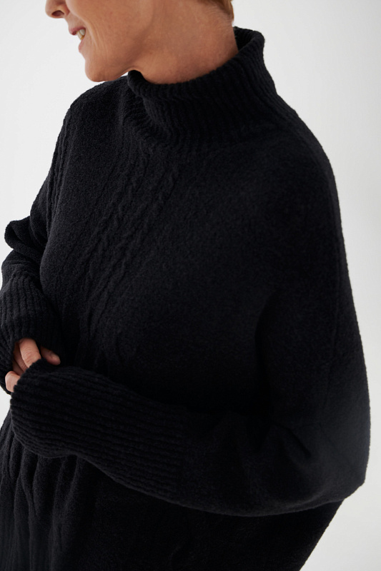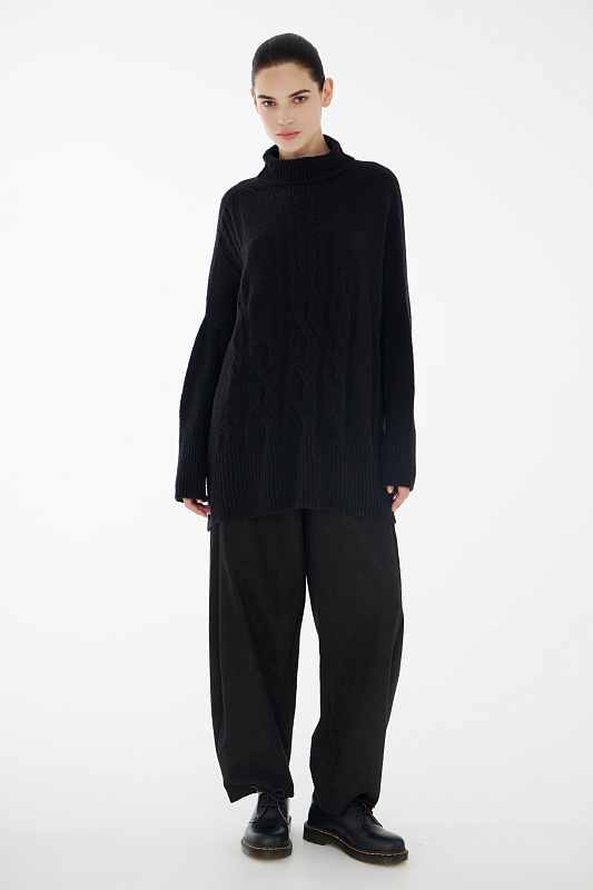 Вязаный джемпер расслабленного прямого силуэта с разрезами по бокам и удлиненной спинкой, с длинным рукавом и горловиной – стойкой. Выполнен из не теряющей своей актуальности переплетения с косами, которое образует объемный и неравномерный эффект.