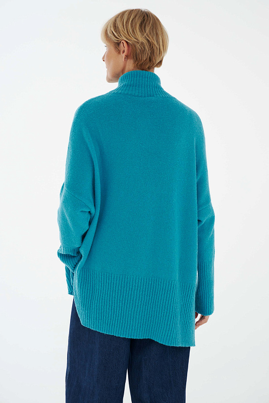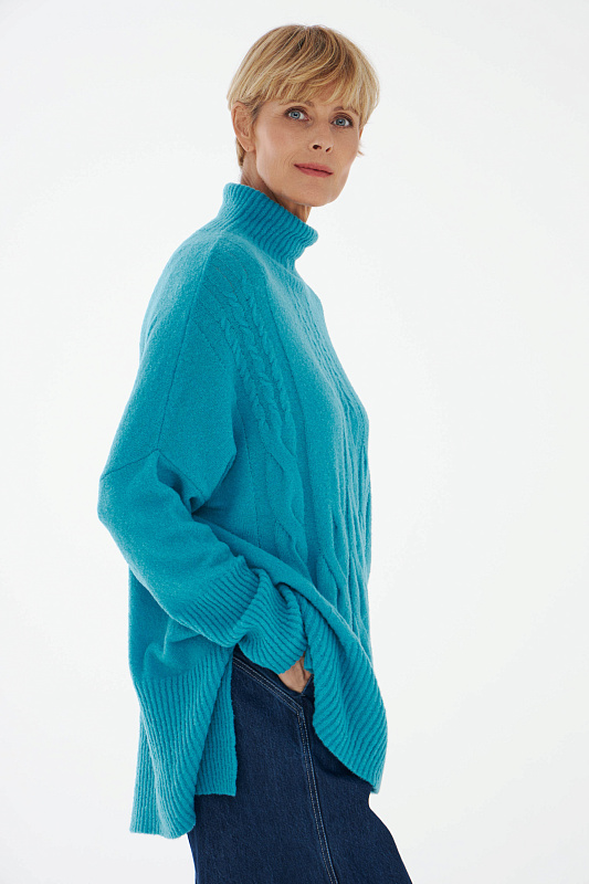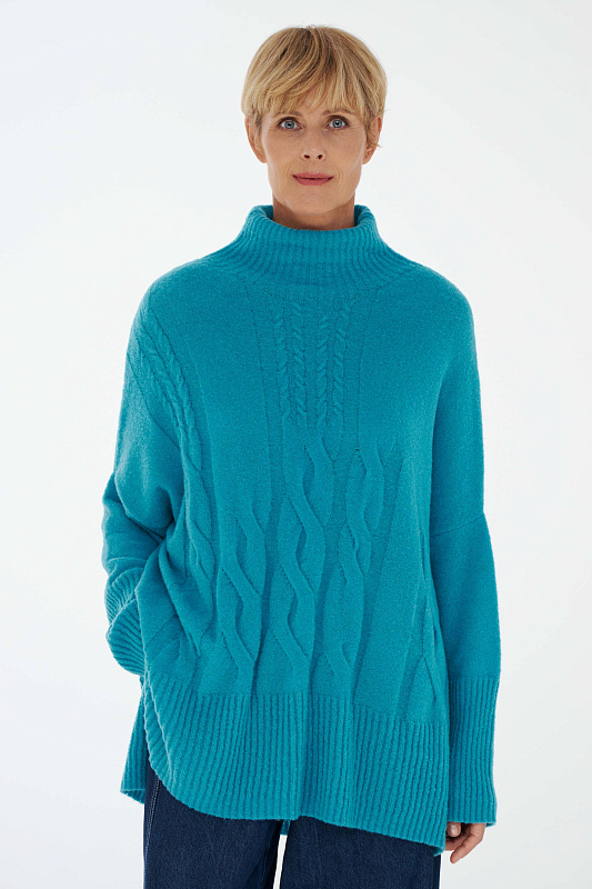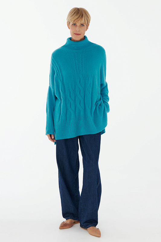 Вязаный джемпер расслабленного прямого силуэта с разрезами по бокам и удлиненной спинкой, с длинным рукавом и горловиной – стойкой. Выполнен из не теряющей своей актуальности переплетения с косами, которое образует объемный и неравномерный эффект.