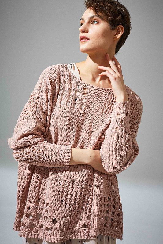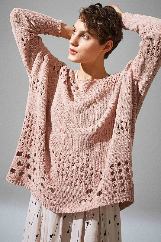 Легкий джемпер из хлопка. Спущенная линия плеча, длинный рукав, вырез горловины лодочка. Оригинальное сочетание фактурной вязки с трендом этого сезона «рваными дырами» и принтом в стиле «гранж». Модель выполнена из рельефной ленточной итальянской пряжи.
