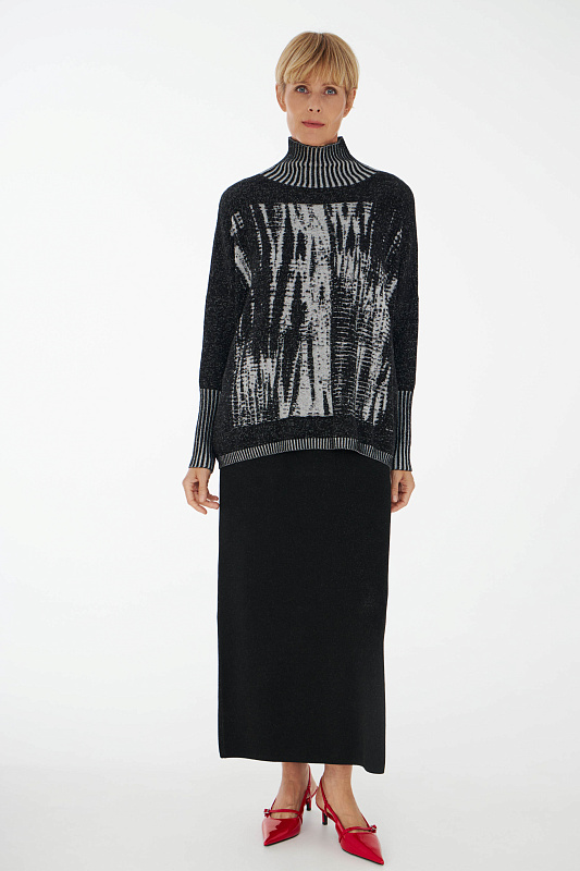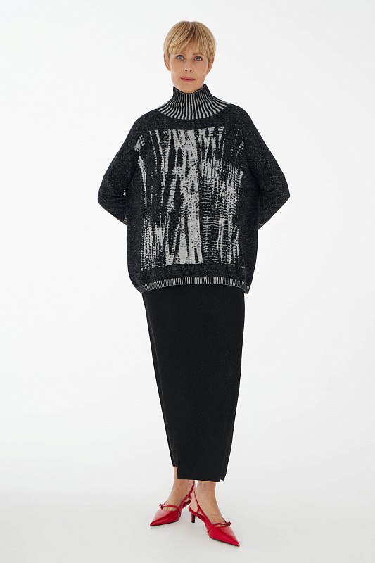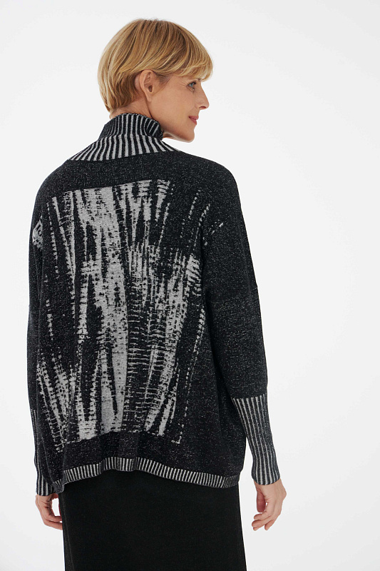 Вязаный джемпер прямого силуэта с авторским абстрактным рисунком. Воротник- мягкая стойка. Удлиненный рукав с эластичным манжетом. Модель выполнена из нежной вискозы с добалением кашемира, что делает джемпер невероятно тактильно приятным.