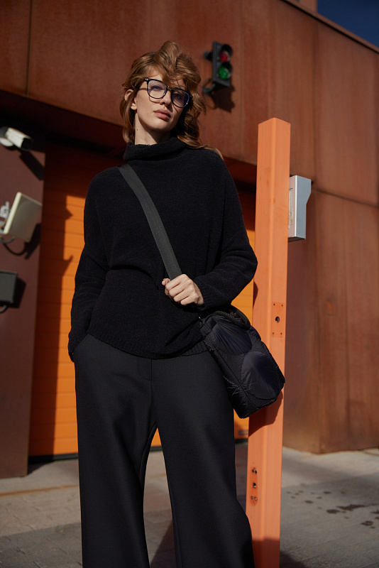 Вязаный джемпер силуэта «ромб». Из мягкой и теплой  буклированной пряжи. Выполнен изнаночной кулирной гладью. Спущенная линия плеча, воротник-хомут.