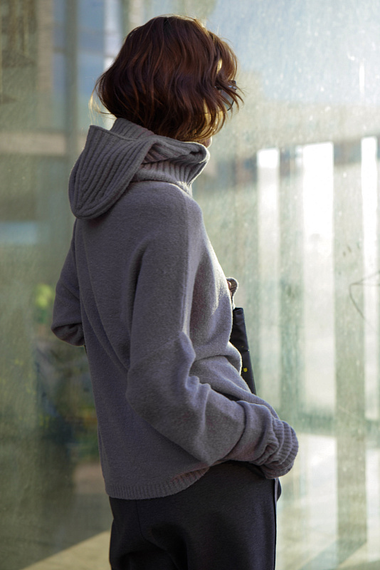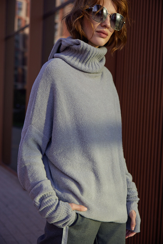 Вязаный джемпер силуэта «ромб». Из мягкой и теплой  буклированной пряжи. Выполнен изнаночной кулирной гладью. Спущенная линия плеча, воротник-хомут.