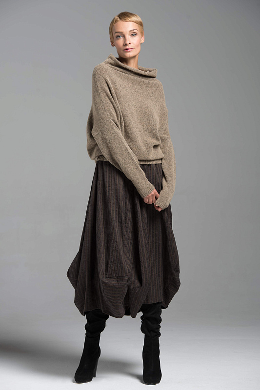 Джемпер "Ромб" из тонкой итальянской шерсти. Спущенная линия плеча, воротник-хомут, силуэт ромб, рукава обвязаны тонкой резинкой, низ изделия обвязан широкой резинкой подчеркивающей тилию. Длина изделия по спинке 79 см.