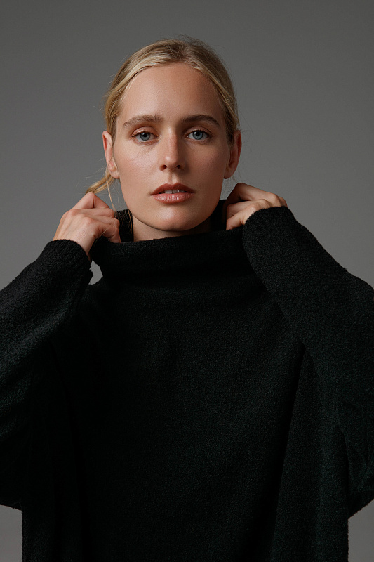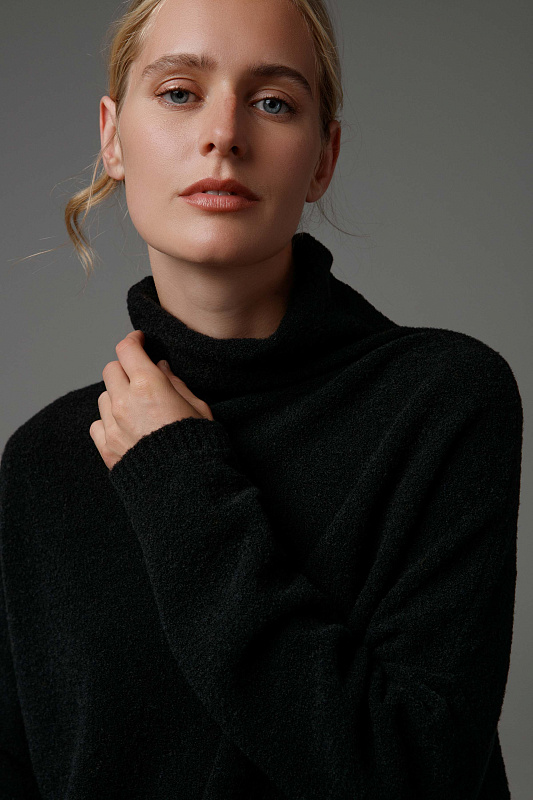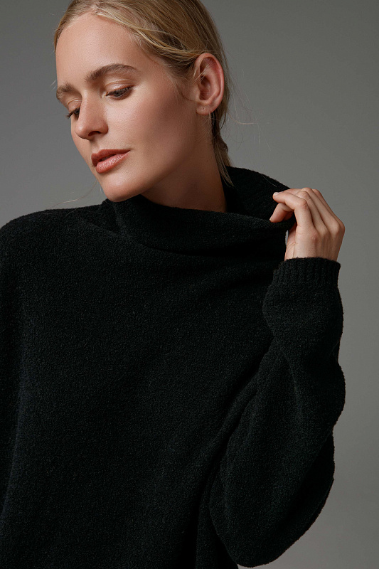 Уютный теплый джемпер силуэта «ромб» из тонкой итатьянской буклированной пряжи. Выполнен изнаночной кулирной гладью. Спущенная линия плеча,  воротник - мягкий хомут. Модель представлена в едином размере.