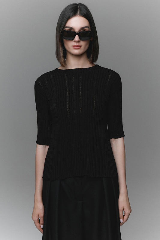 Вязаный джемпер с коротким рукавом полуприлегающего силуэта. Круглый вырез горловины. Выполнен из итальянской глянцевой вискозы высокой степени крутки ластичным переплетением с протяжками.
