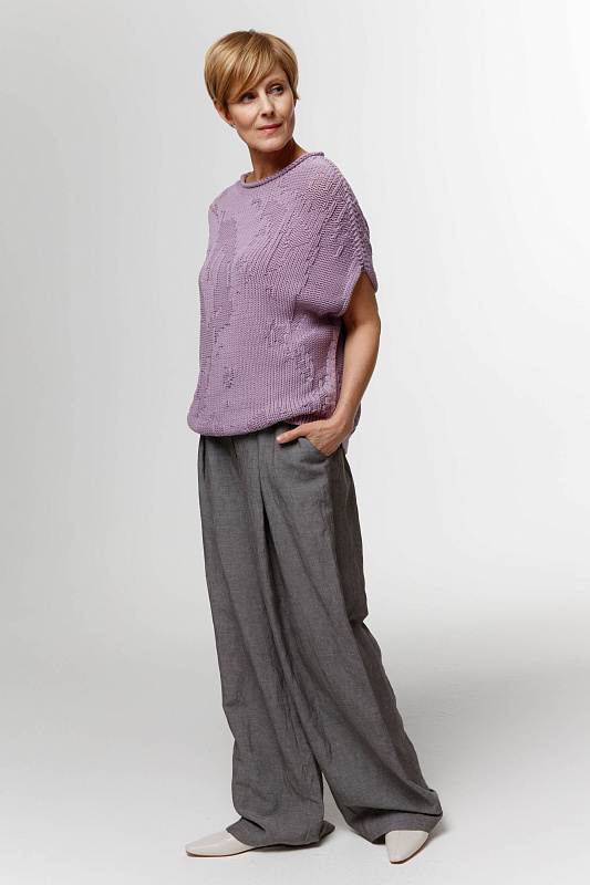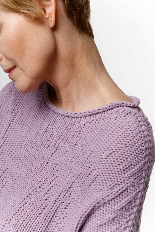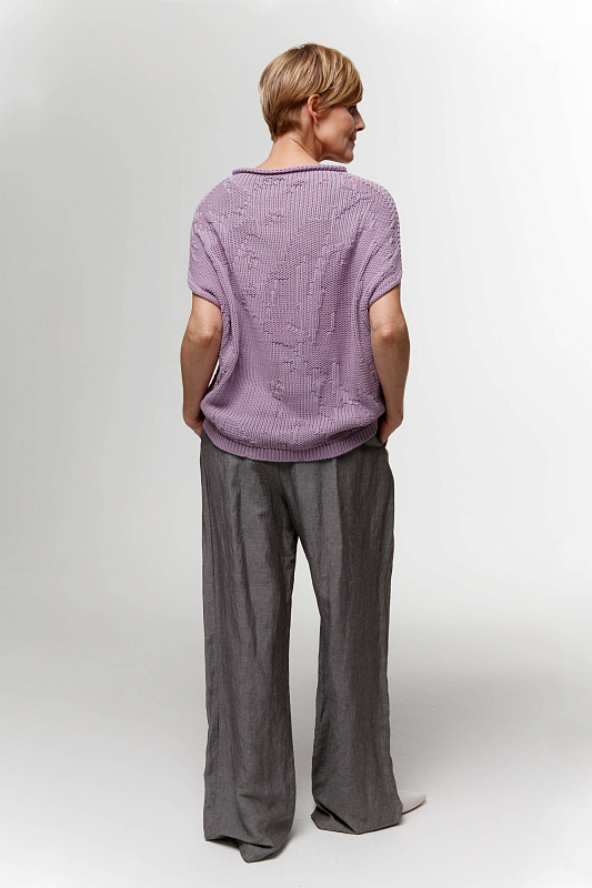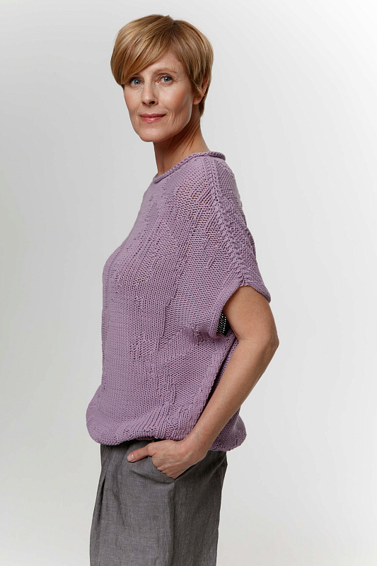 Цельновязанный джемпер с коротким рукавом. Вырез горловины – лодочка. Спущенная линия плеча придает образу мягкость. Выполнен из структурной фантазийной итальянской пряжи из коллекции натуральных пряж в виде вязаного шнурка с воздушным наполнителем, придающим дополнительный объем рисунку изделия.