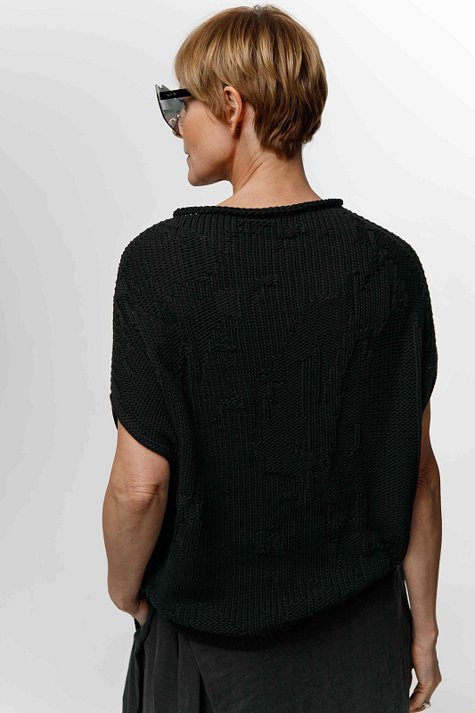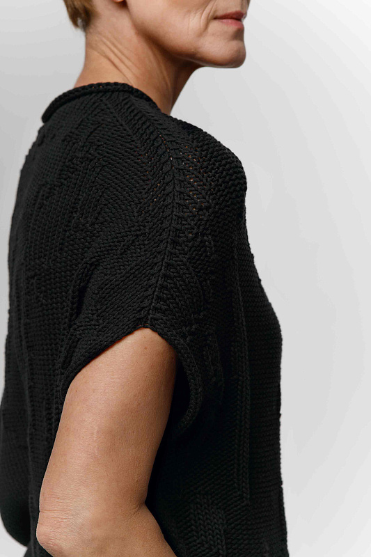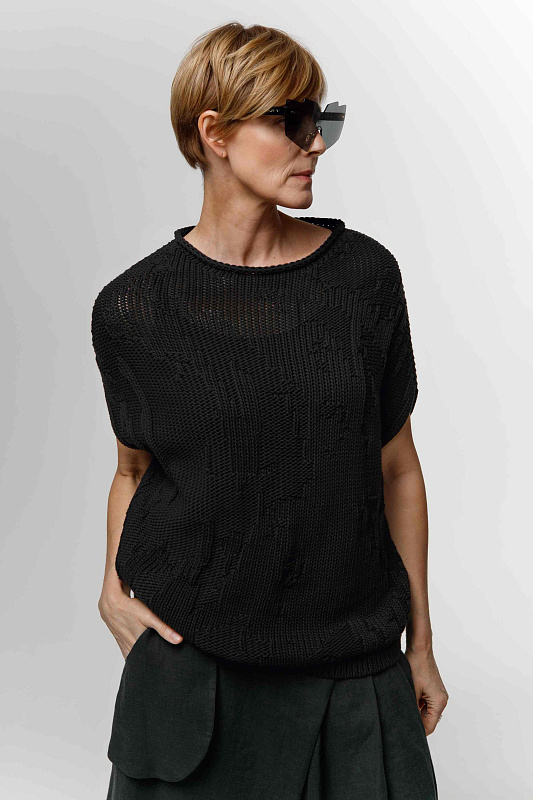 Цельновязанный джемпер с коротким рукавом. Вырез горловины – лодочка. Спущенная линия плеча придает образу мягкость. Выполнен из структурной фантазийной итальянской пряжи из коллекции натуральных пряж в виде вязаного шнурка с воздушным наполнителем, придающим дополнительный объем рисунку изделия.