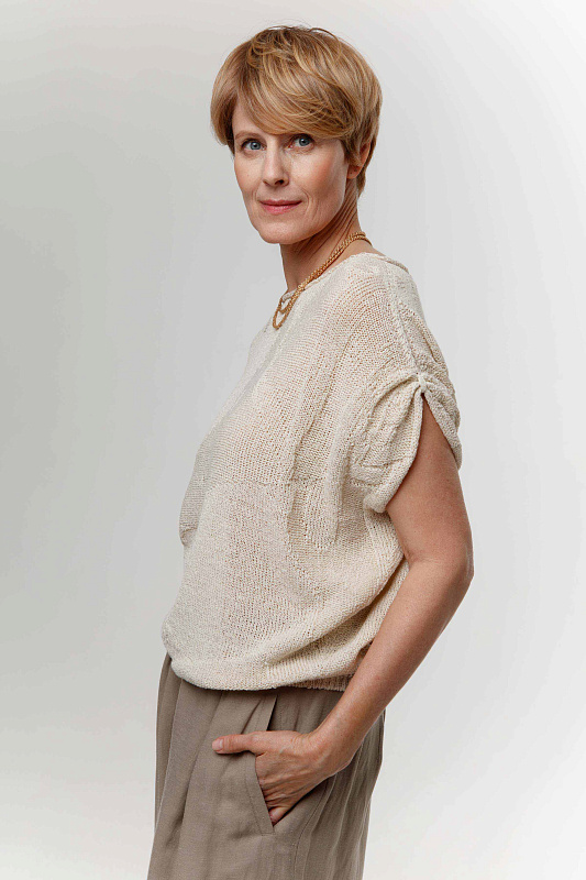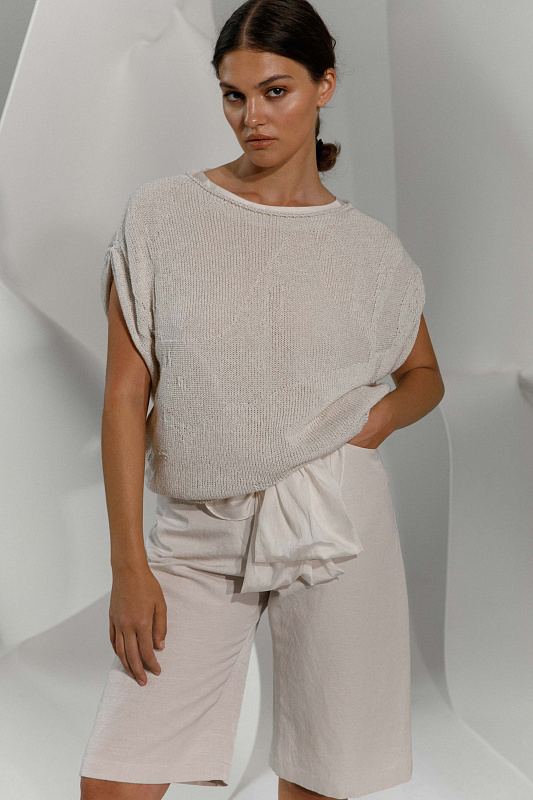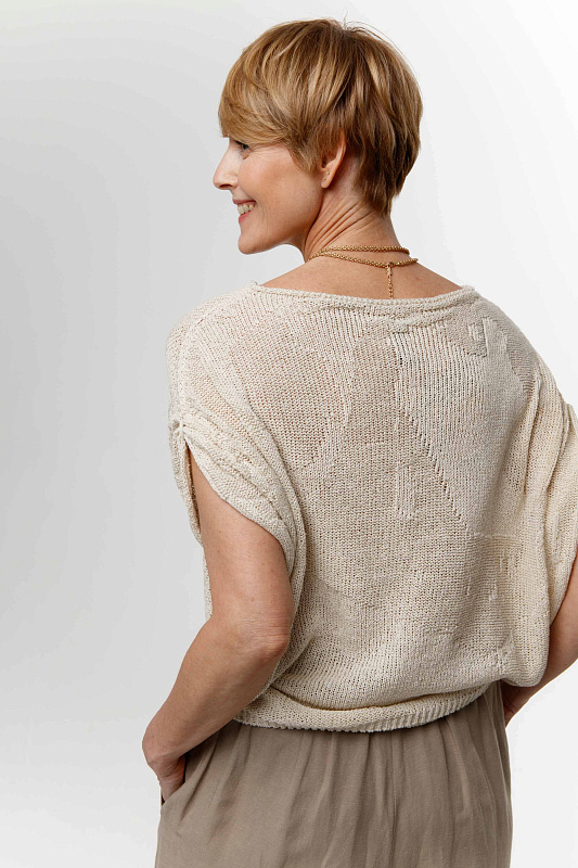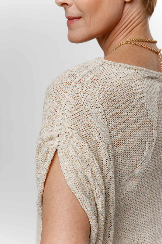 Цельновязанный джемпер с коротким рукавом и с драпировками по плечам с вывязанным абстрактным рисунком. Вырез горловины – лодочка с руликом. Выполнен из экологичной итальянской пряжи, в составе которой присутствуют восстановленные волокна.