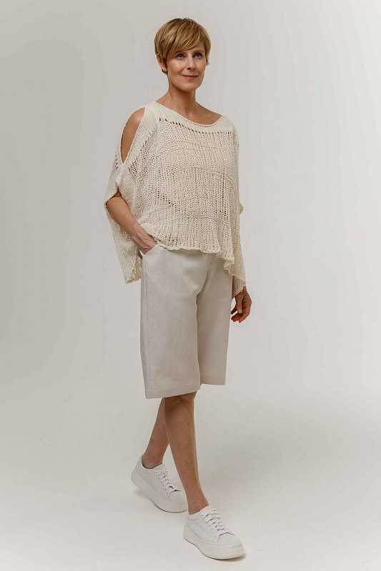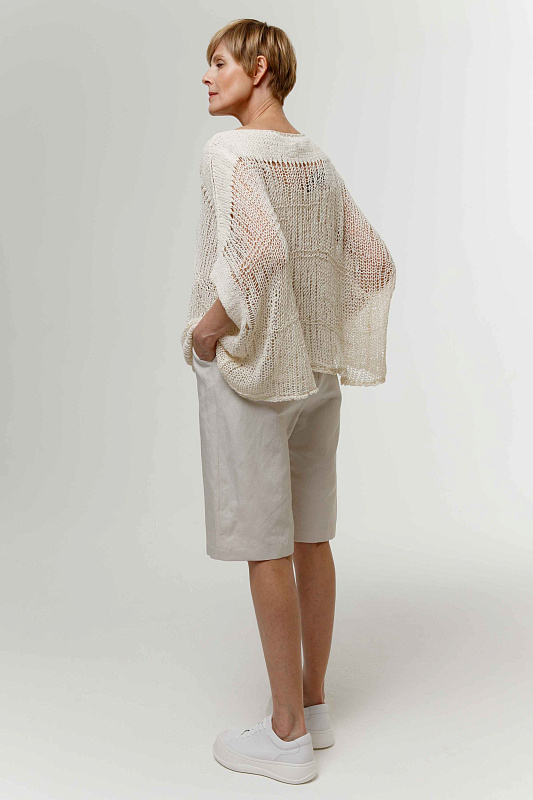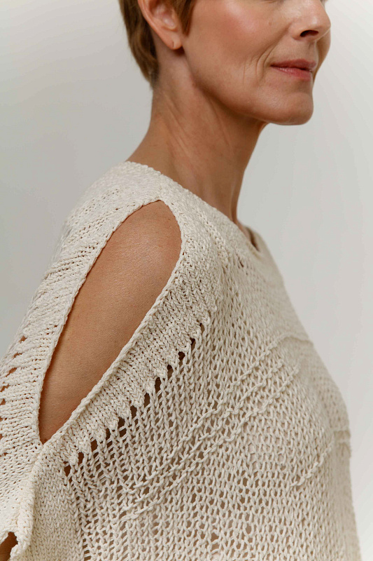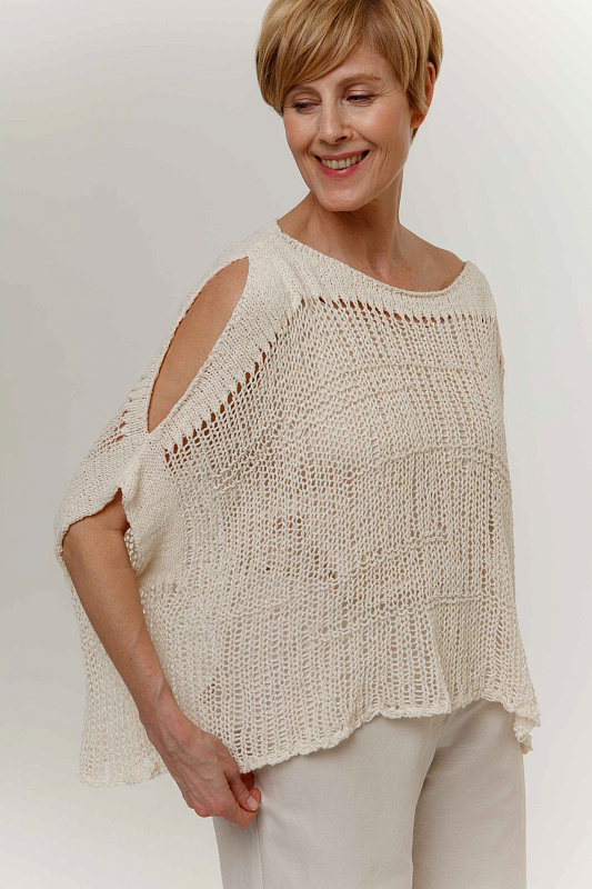 Джемпер прямого расслабленного силуэта с разрезами на рукавах. Горловина лодочка с руликом. Выполнен в ажурной технике вязания в виде объемной сетки из экологичной фасонной итальянской ленточной пряжи.