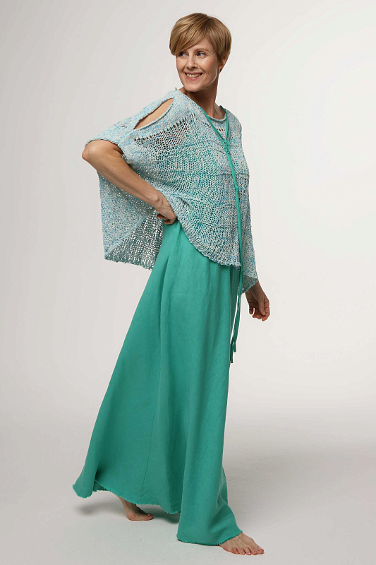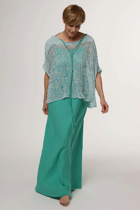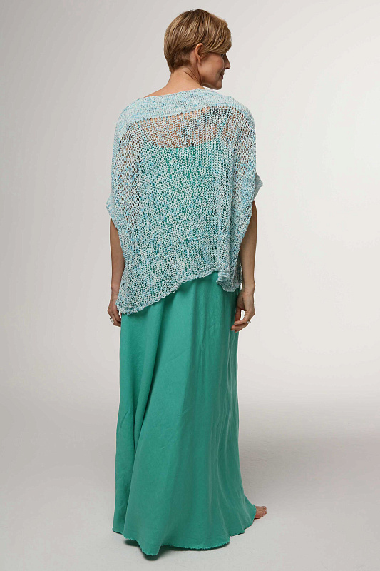 Джемпер прямого расслабленного силуэта с разрезами на рукавах. Горловина лодочка с руликом. Выполнен в ажурной технике вязания в виде объемной сетки из экологичной фасонной итальянской ленточной пряжи.