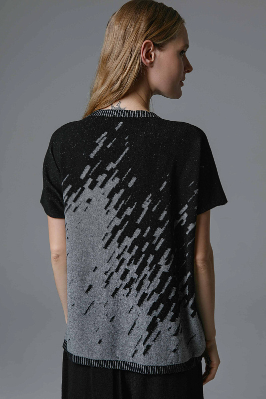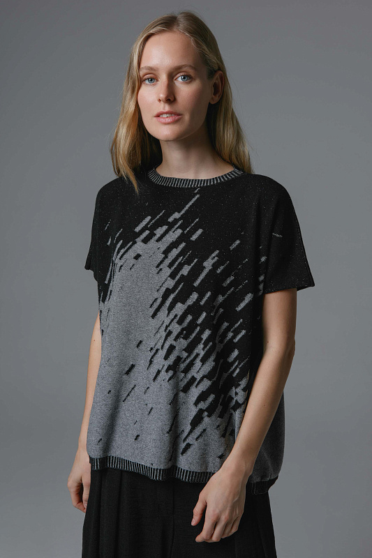 Вязаный джемпер прямого силуэта с круглым вырезом горловины и вывязанным по контуру коротким рукавом. С абстрактным графическим рисунком по переду изделия и спинке. Выполнен на контрасте теплой текстуры вискозы с кашемиром и матовой вискозы. Тонкая техника вязки делает полотно тактильно приятным и пластичным.