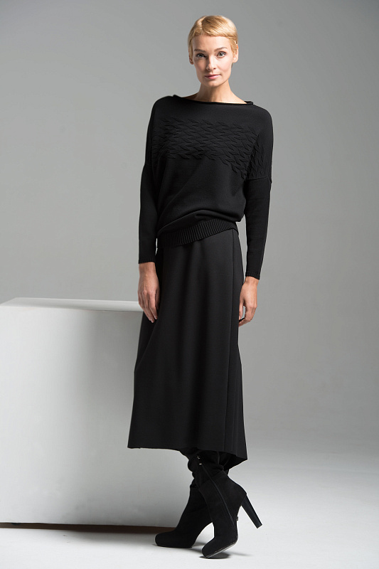 Нежный и уютный джемпер из итальянской вискозы может легко стать базовой частью любого гардероба, спущенная линия плеча, вырез горловины лодочка, рукава и низ изделия обвязаны тонкой резинкой, объемный рисунок на полочке и спинке. Длина изделия по спинке 60 см.