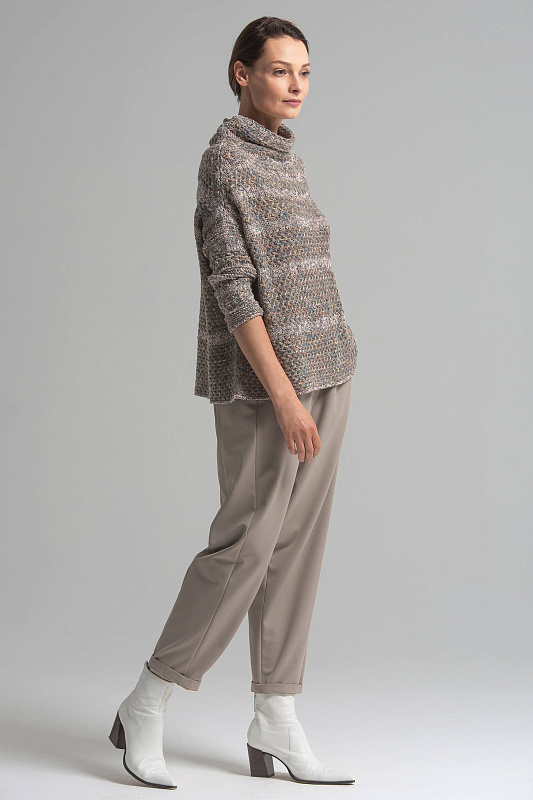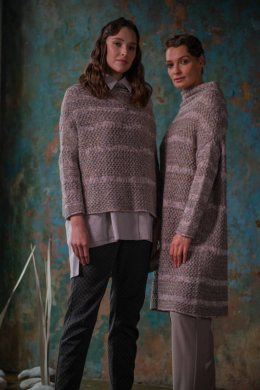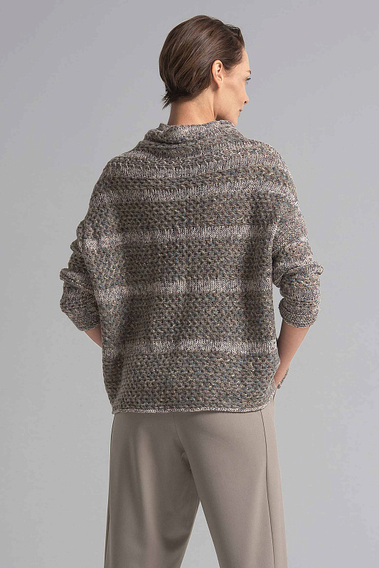 Теплый и мягкий джемпер, выполненный из фантазийной пряжи из восстановленных волокон. Сочетание объемной фактурной вязки с гладкой вязкой с лёгким мерцающим эффектом.