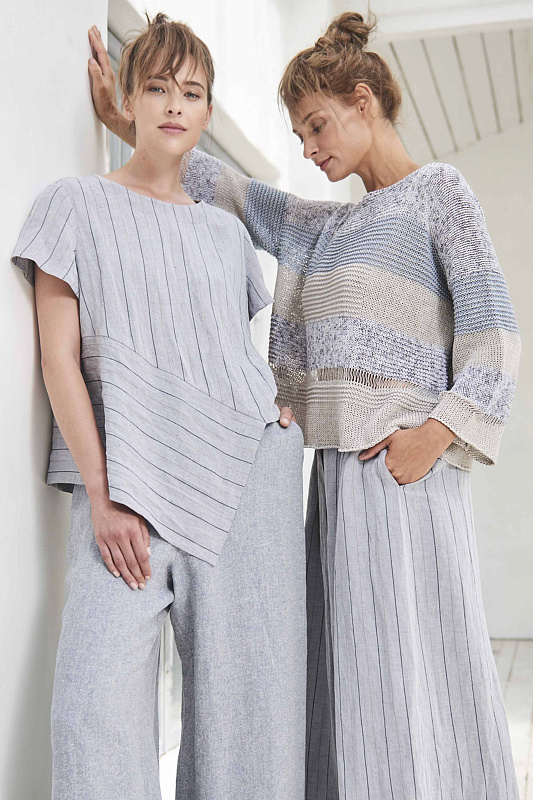 Легкий летний джемпер с протяжками, прямой силуэт, вырез горловины - лодочка, длинный рукав. Сочетание нескольких фактур пряжи, нежные оттенки, протяжки на рукавах, спинке и полке, различные переплетения создают легкий и воздушный образ на каждый день. Длина по спинке 50 см. Итальянская пряжа.