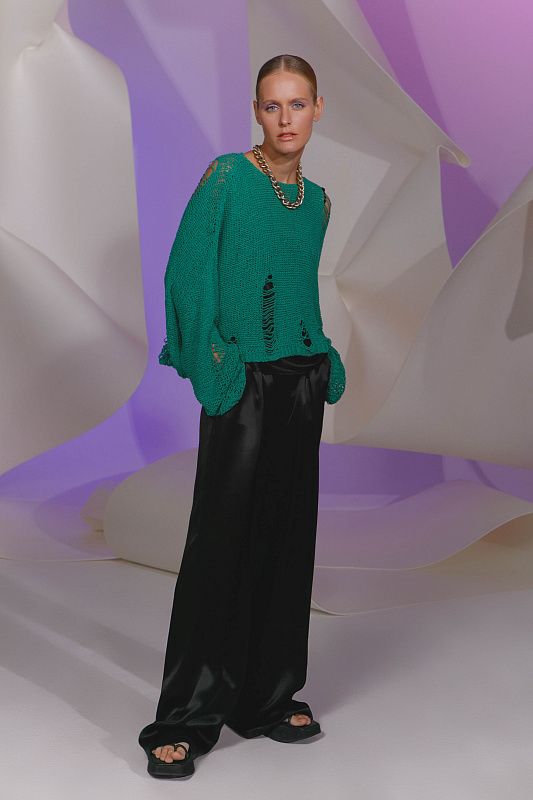 Джемпер прямого расслабленного силуэта с длинным рукавом и круглой горловиной. Выполнен из фасонной Итальянской ленточной пряжи. С эффектом спущенных петель по плечу и низу изделия, которые создают впечатление поврежденного полотна и рваных краев джемпера.