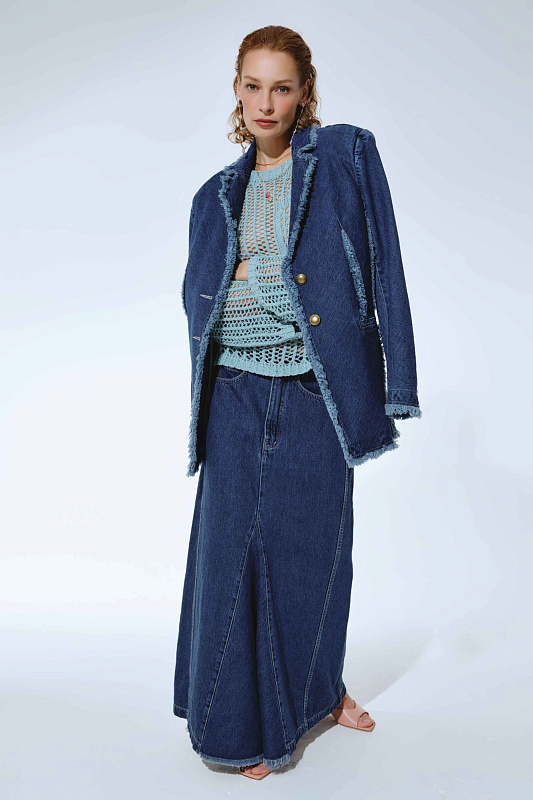 Вязаный джемпер прямого расслабленного силуэта с длинным рукавом и круглой горловиной. Выполнен из фасонной экологичной итальянской буклированной пряжи со льном из коллекции экологичных пряж. Изысканный вид придает ажурная техника вязания в сочетании с плотной вязкой в виде квадратов.