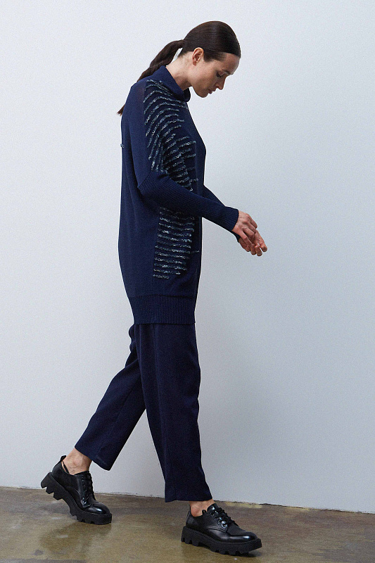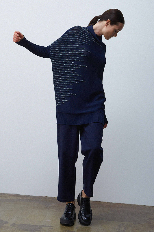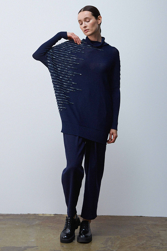 Удлиненным джемпер с рисунком из фантазийной пряжи из нежной итальянской вискозы, силуэт овал, воротник хомут.