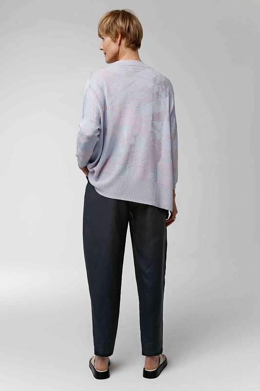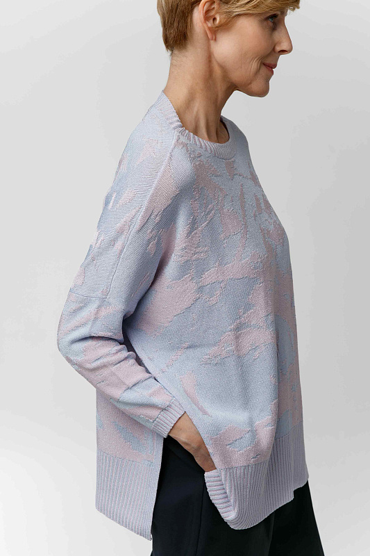 Вязаный джемпер прямого силуэта с разрезом по боковому шву, горловина круглая. Выполнен из итальянской глянцевой струящейся вискозы в технике меланж с абстрактным текстурированным рисунком.