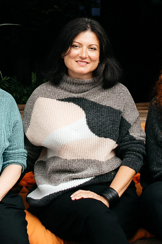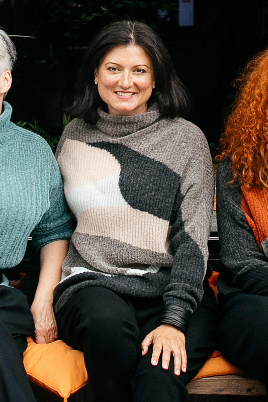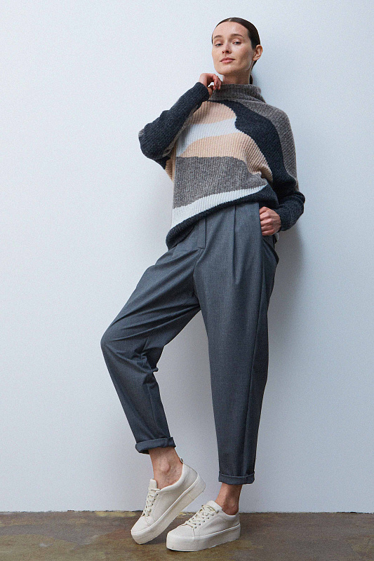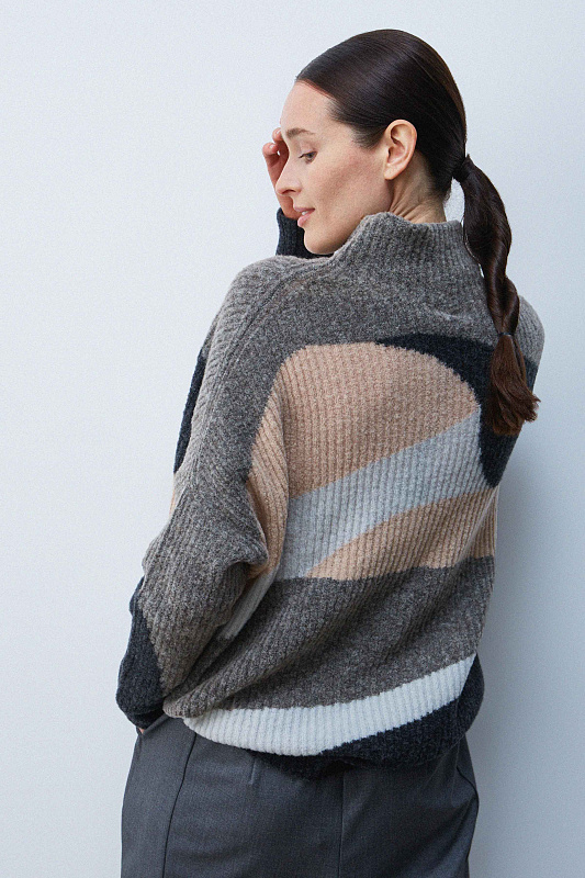 Джемпер силуэта «ромб» из тонкой буклированной итальянской шерсти. Спущенная линия плеча, воротник-хомут. Джемпер выполнен интарсионным способом на базе ластика. По рукавам и низу изделия — резинка