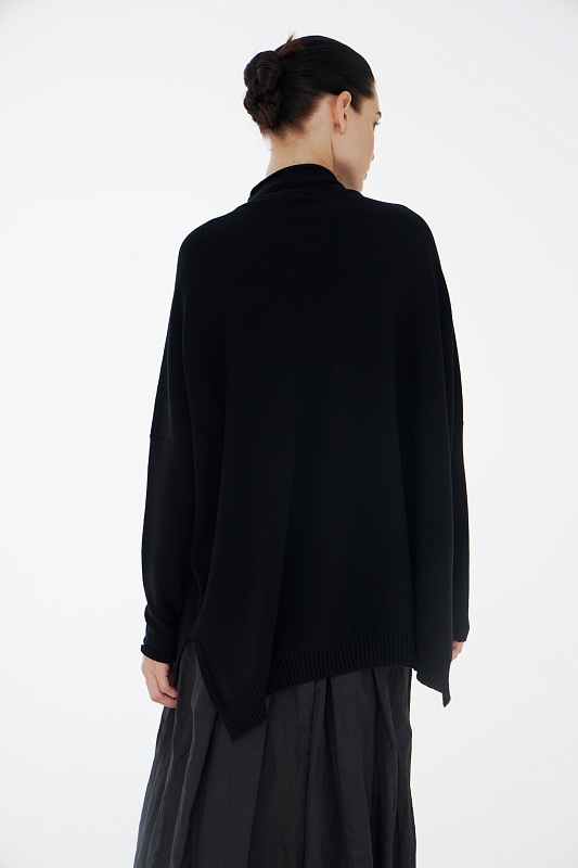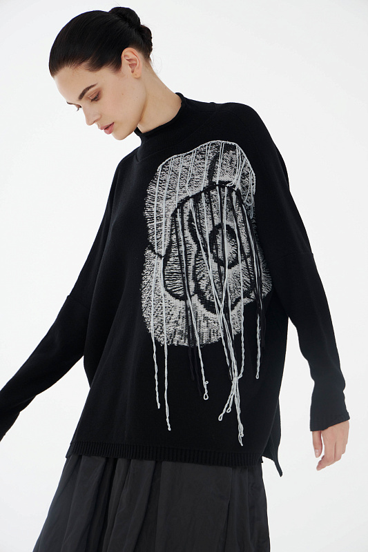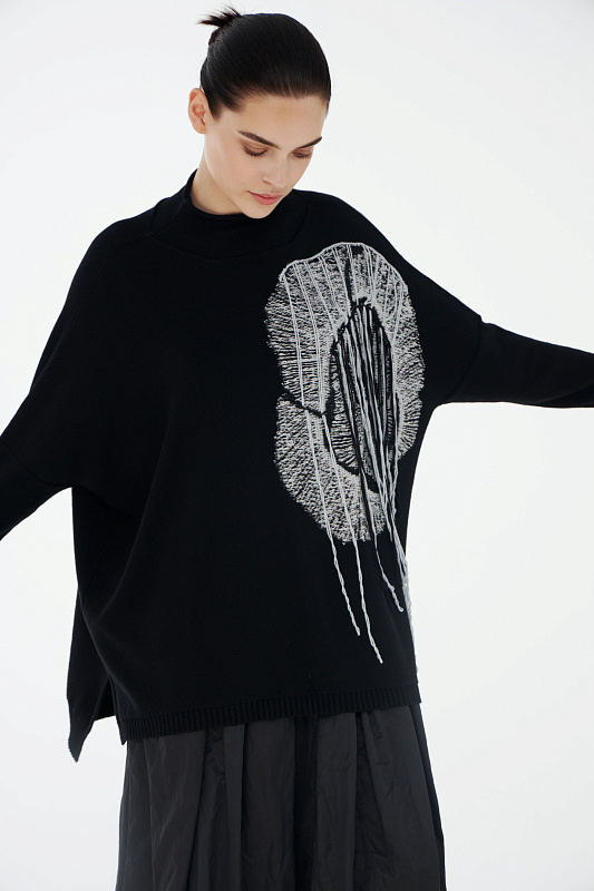 Авангардный вязаный джемпер прямого силуэта с разрезами по бокам и с воротником- стойкой с мягким руликом. Выполнен из нежной вискозы с добавлением кашемира и тонкой шерсти мериноса. Эффектный акцент – абстрактный рисунок большого цветка дополнительно декорирован неравномерно свисающими нитями.