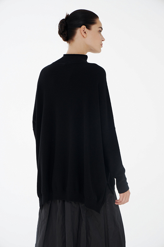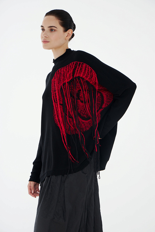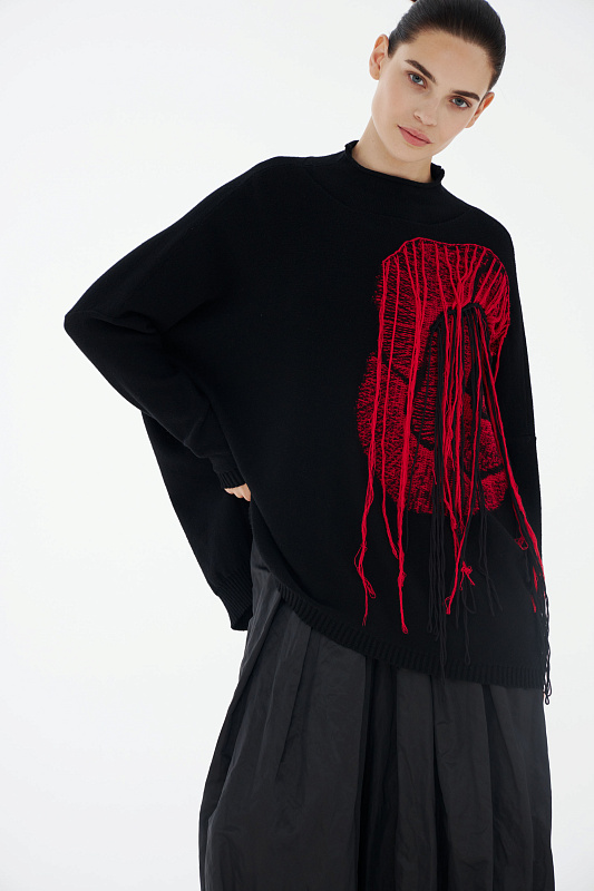 Авангардный вязаный джемпер прямого силуэта с разрезами по бокам и с воротником- стойкой с мягким руликом. Выполнен из нежной вискозы с добавлением кашемира и тонкой шерсти мериноса. Эффектный акцент – абстрактный рисунок большого цветка дополнительно декорирован неравномерно свисающими нитями.