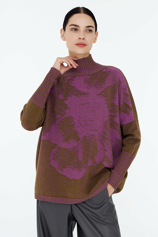Изысканный вязаный джемпер с воротником- стойкой из нежной вискозы с кашемиром. Выполнен переплетением с абстрактным рисунком в виде цветочного мотива расположенного на плече. Тонкое полотно делает изделие тактильно приятным.