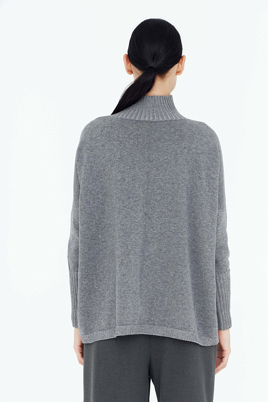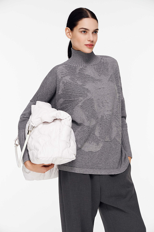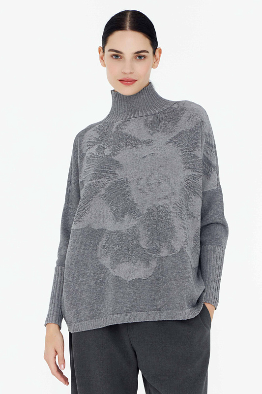Изысканный вязаный джемпер с воротником- стойкой из нежной вискозы с кашемиром. Выполнен переплетением с абстрактным рисунком в виде цветочного мотива расположенного на плече. Тонкое полотно делает изделие тактильно приятным.