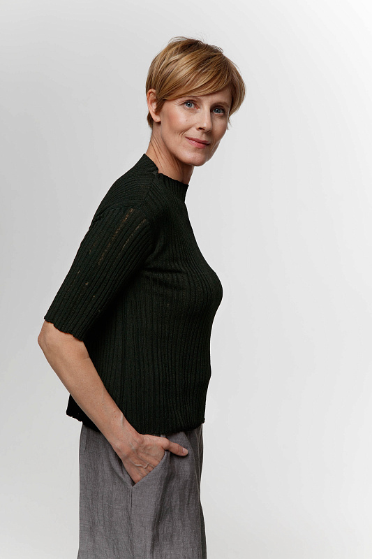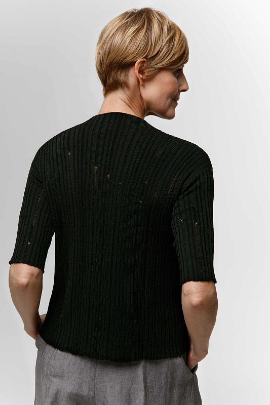 Вязаный джемпер - водолазка полуприлегающего  силуэта, горловина - невысокая стойка, укороченный рукав. Выполнен из итальянской глянцевой струящейся вискозы ластичным переплетением с ажурными отверстиями и протяжками.