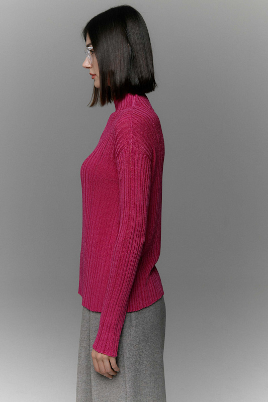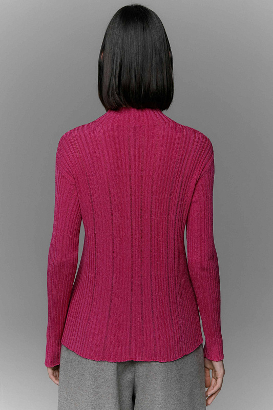 Вязаный джемпер - водолазка полуприлегающего силуэта, горловина - невысокая стойка, длинный рукав. Выполнен из итальянской крепированной струящейся вискозы ластичным переплетением с протяжками. В контрастных вариантах модели рисунок выкладывается за счет хаотичного распределения нитей разных цветов.