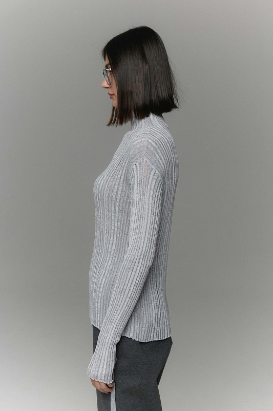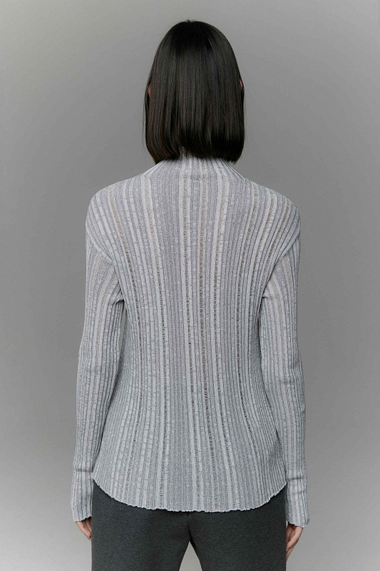 Вязаный джемпер - водолазка полуприлегающего силуэта, горловина - невысокая стойка, длинный рукав. Выполнен из итальянской крепированной струящейся вискозы ластичным переплетением с протяжками. В контрастных вариантах модели рисунок выкладывается за счет хаотичного распределения нитей разных цветов.