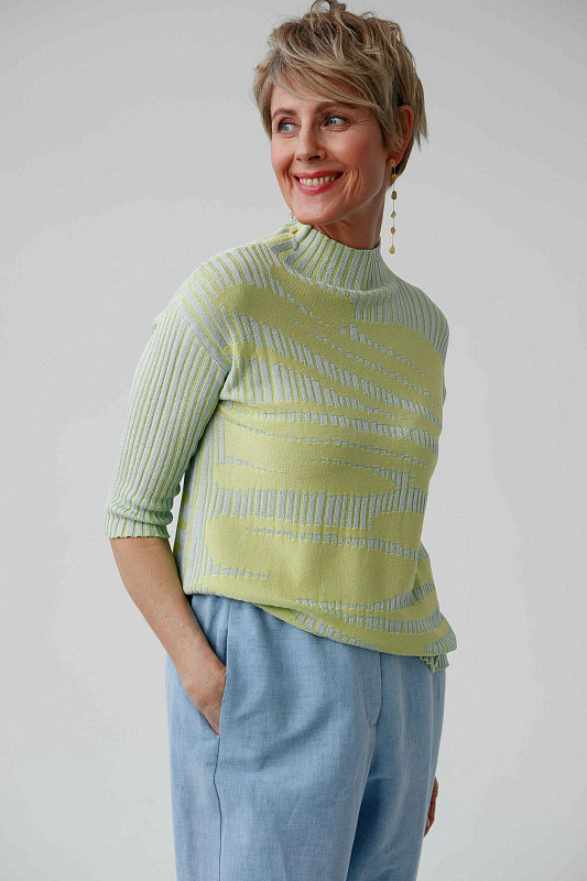 Джемпер водолазка полуприлегающего  силуэта, горловина - не высокая стойка, короткий рукав. Выполнен из Итальянской глянцевой струящейся вискозы с контрастным рисунком природных мотивов.