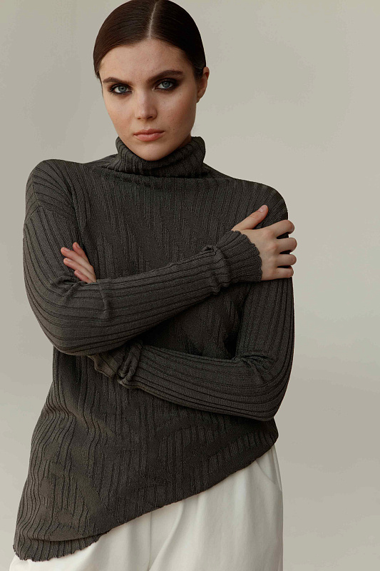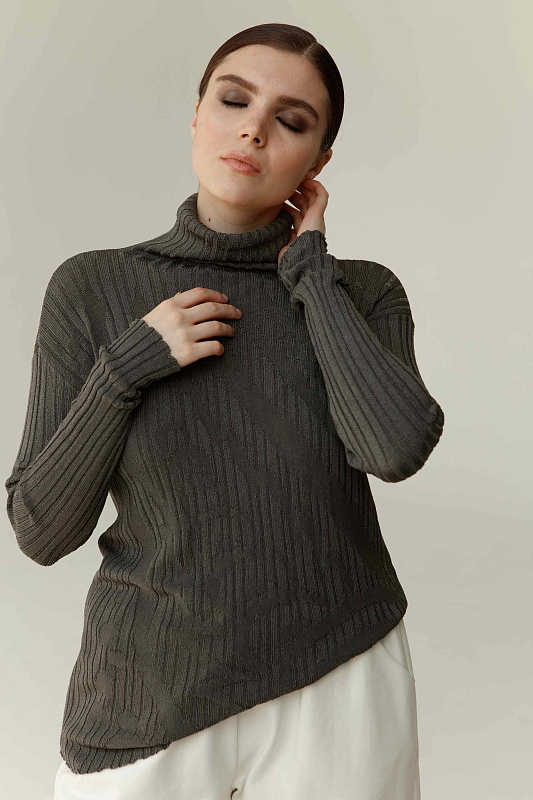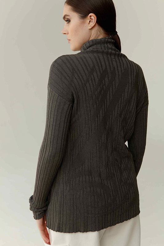 Мягкая облегающая водолазка из нежной глянцевой вискозы с ориентальным узором. Воротник стойка, удлиненный рукав.