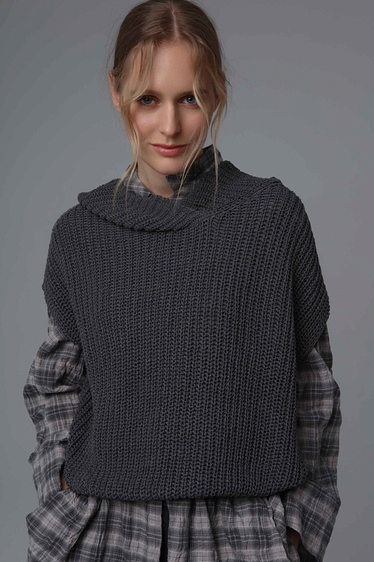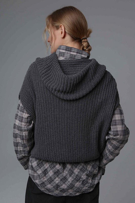 Цельновязаный жилет с коротким рукавом, вальяжным капюшоном и с эластичной резинкой по низу изделия. Выполнен в технике воздушного переплетения, которое придает изделию плавность линий силуэта. Из экологичной итальянской пряжи с ненавязчивым мерцающим эффектом. В составе пряжи присутствуют восстановленные волокна.