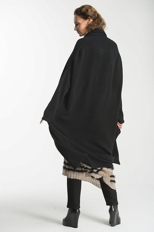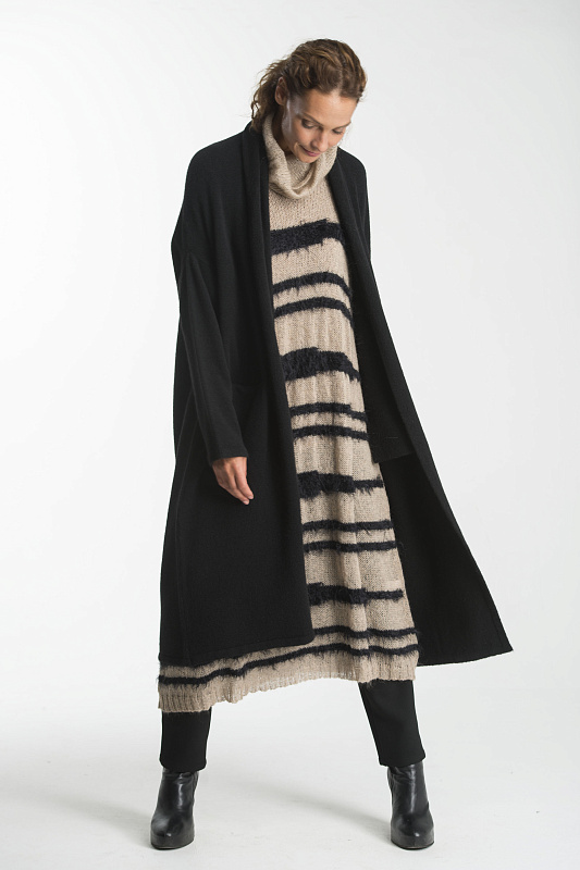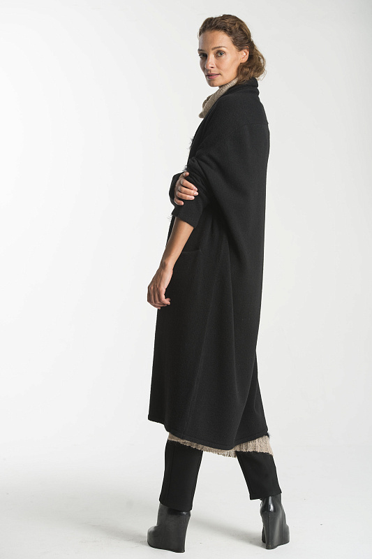 Удлиненный вязаный кардиган с воротником шалька и спущеной линией плеча. Впереди цельновязаные карманы. Вязаный кардиган красиво облегает фигуру и смотрится необыкновенно женственно.