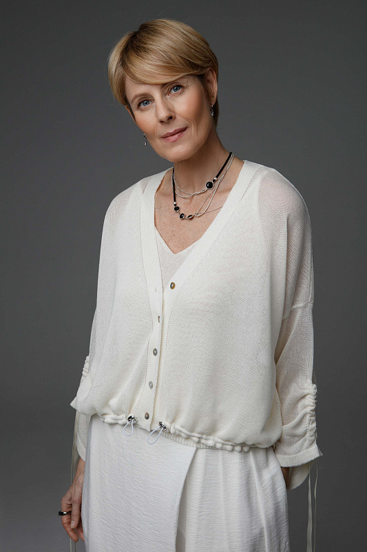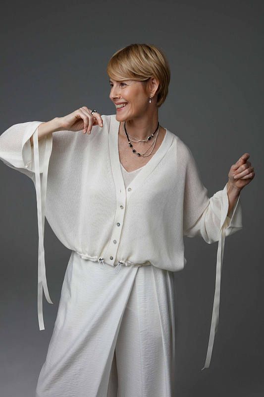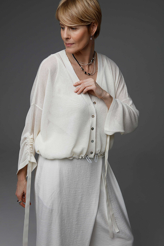 Легкий и комфортный кардиган прямого силуэта с кулиской по низу изделия и V- образной горловиной. С широким рукавом с драпировкой и эффектными завязками из декоративной ленты. Полупрозрачное струящееся полотно. Модель выполнена из тонкой и нежной Итальянской вискозы с мерцающим блеском.