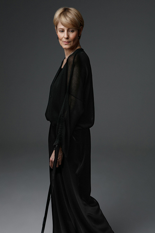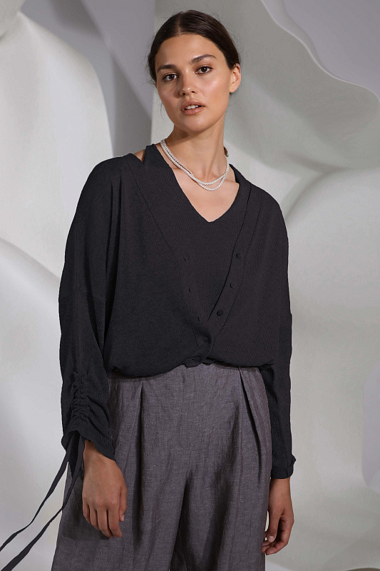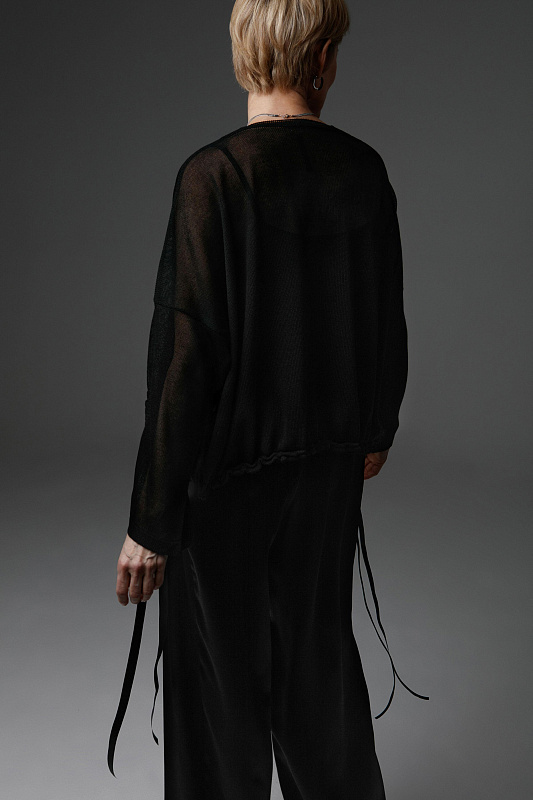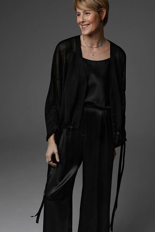 Легкий и комфортный кардиган прямого силуэта с кулиской по низу изделия и V- образной горловиной. С широким рукавом с драпировкой и эффектными завязками из декоративной ленты. Полупрозрачное струящееся полотно. Модель выполнена из тонкой и нежной Итальянской вискозы с мерцающим блеском.