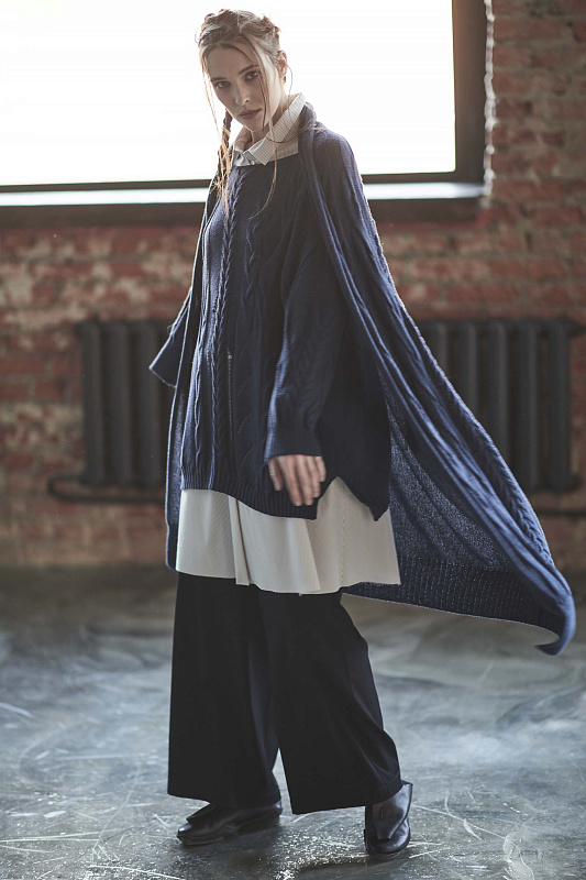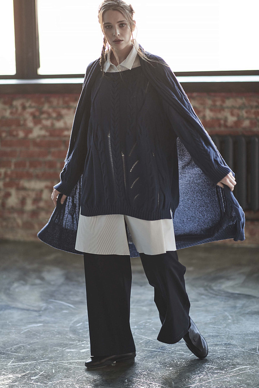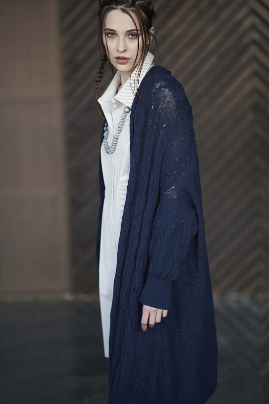Кардиган косы из итальянского хлопка, спущенная линия плеча, длинный рукав, манжеты рукава и низ изделия обвязыны резинкой, без застежки. Кардиган с крупной фактурной вязкой разных видов кос в сочетании с трендом этого сезона - "рваными дырами". Длина изделия по спинке 100 см.