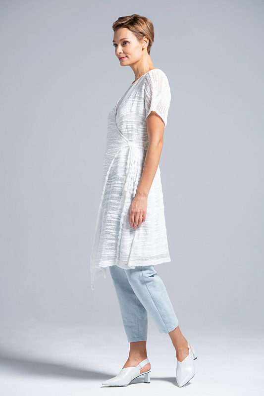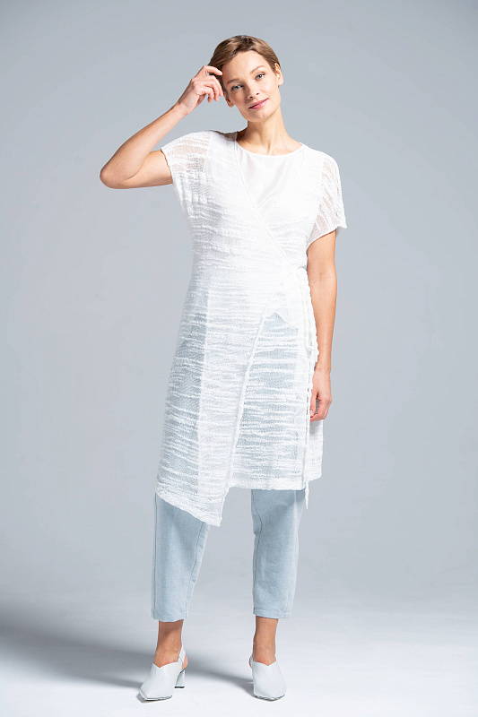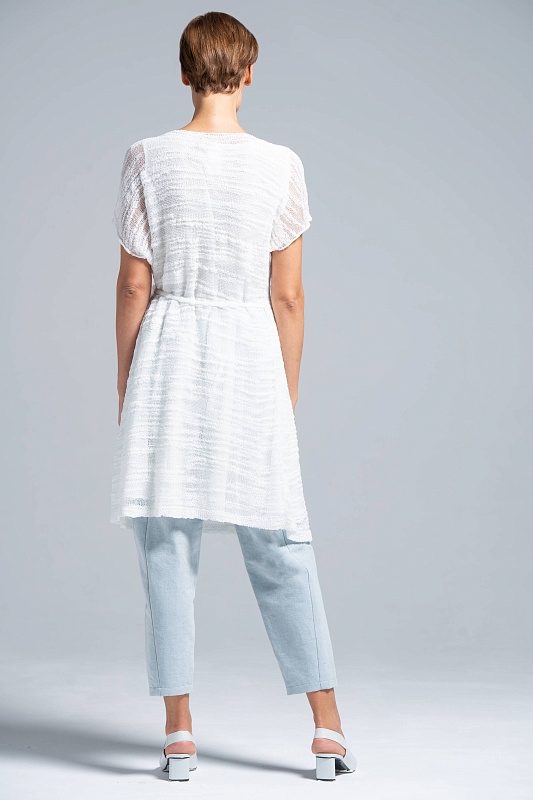 Оригинальный кардиган замотайка на поясе, А-силуэт, спущенная линия плеча, V-образный вырез горловины, низ изделия - асимметрия. Кардиган из фантазийной итальянской пряжи с утолщением и утоньшением создан специально для капсульной коллекции Resort 2019. Подойдет как на каждый день, так и на вечер. Длинна по спинке 90 см.