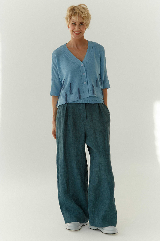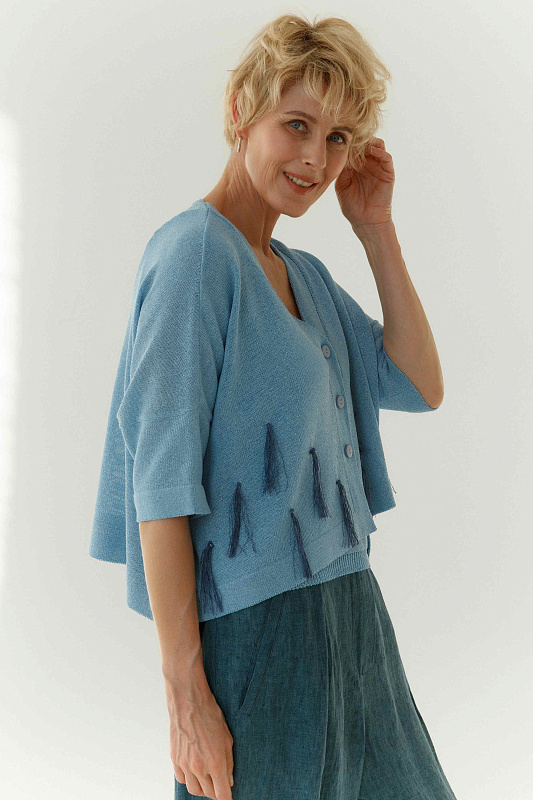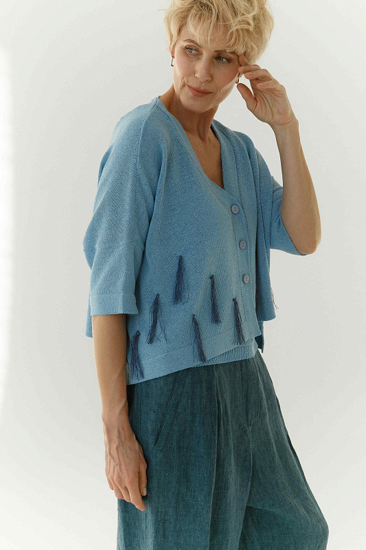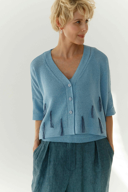 Кардиган свободного прямого силуэта с коротким рукавом и с декором в виде бахромы по переду. Выполнен из экологичной Итальянской пряжи.
