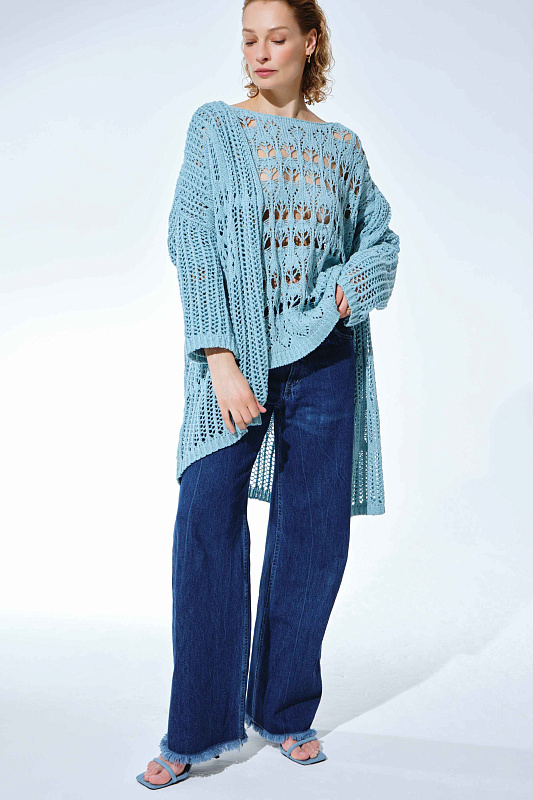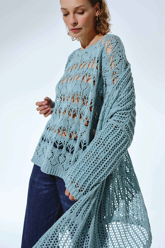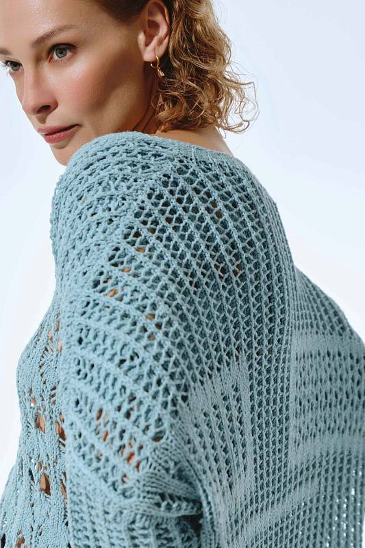 Вязаный кардиган прямого силуэта с длинным рукавом и V-образной горловиной. Застегивается на пуговицы. Выполнен из фасонной экологичной итальянской буклированной пряжи со льном из коллекции экологичных пряж. Изысканный вид придает ажурная техника вязания в сочетании с плотной вязкой в виде квадратов.