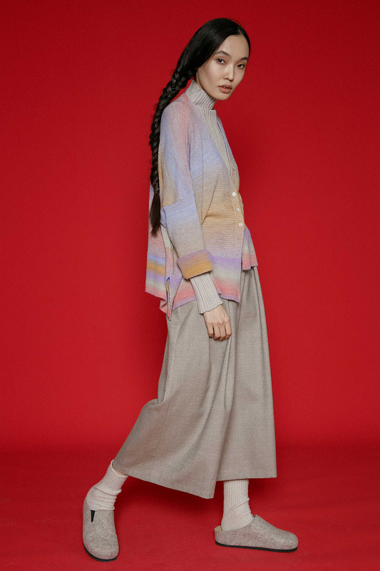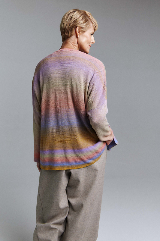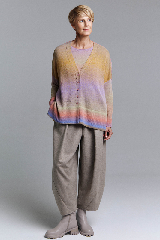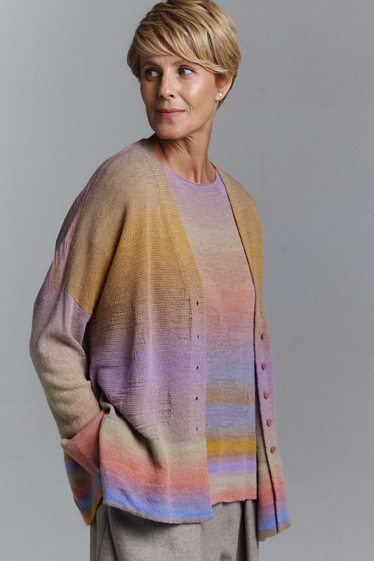 Тонкий вязаный кардиган прямого силуэта с V- образной горловиной с планкой и с широким плотным сдвоенным низом по стану и рукавам. Каждое изделие имеет свой неповторимый переход цвета за счет пряжи секционного крашения. Асимметричное расположение распределения цвета является элементом дизайна изделия. Возможно усложнить стилизацию кардигана за счет асимметричного варианта застегивания на пуговицы.