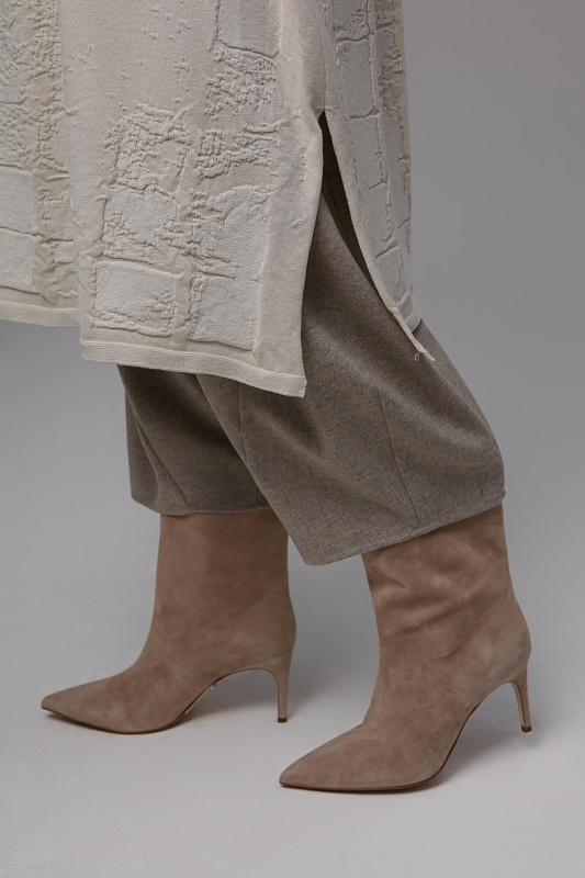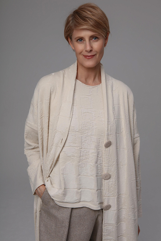 Удлиненный вязаный кардиган прямого силуэта с шалевидным воротником, создающим V-образную горловину. Абстрактный графический рисунок выглядит рельефным, выпуклым  и неравномерным за счет переплетения. Застежка на 3 крупные пуговицы. Выполнен на контрасте теплой текстуры вискозы с кашемиром и матовой вискозы. Благодаря тонкой и уплотненной технике вязки  полотно изделия хорошо держит форму.
