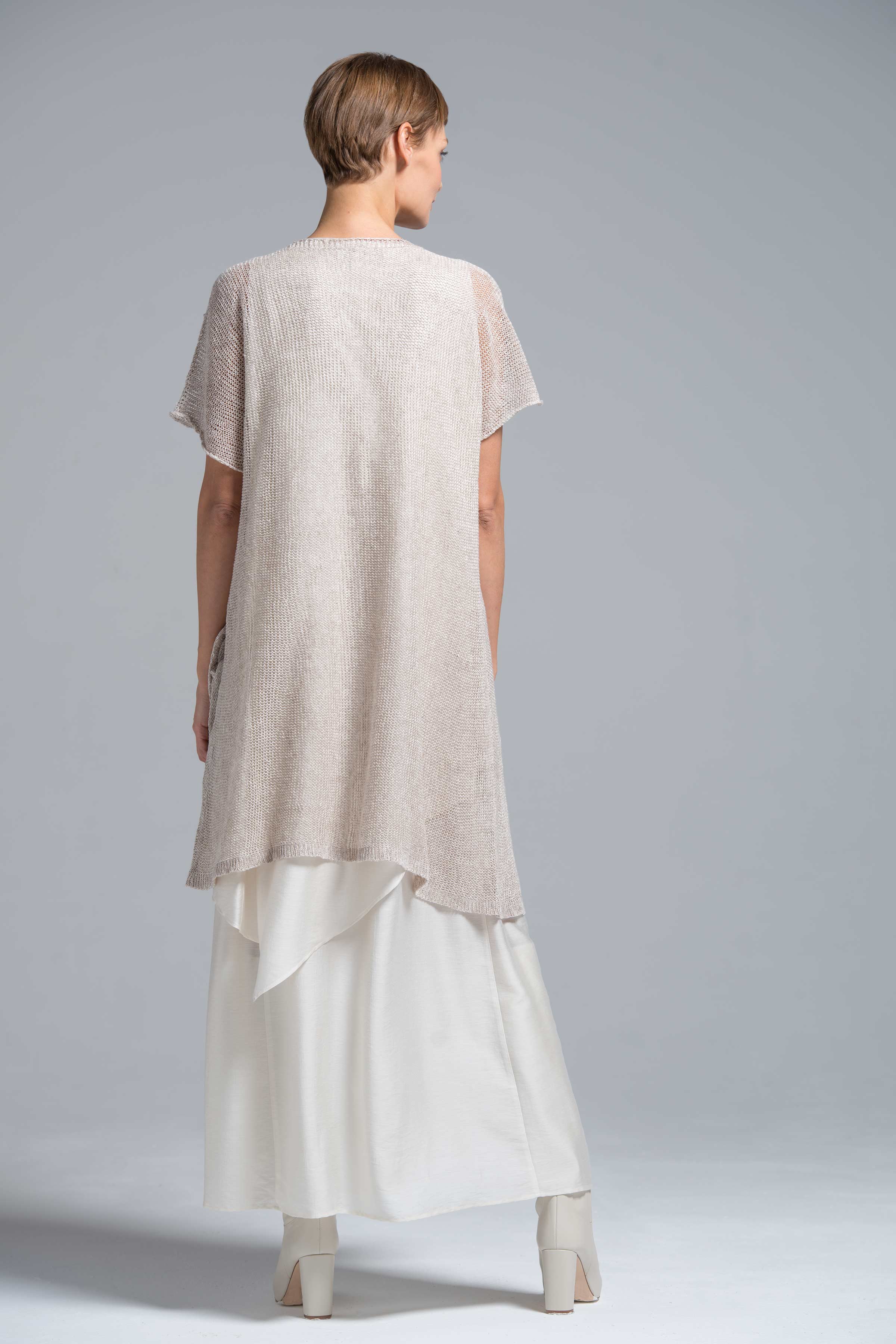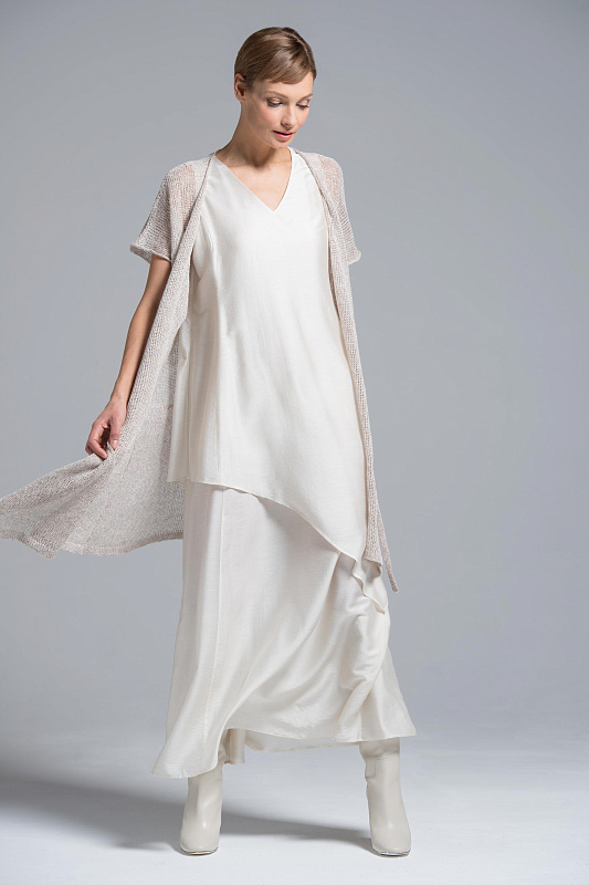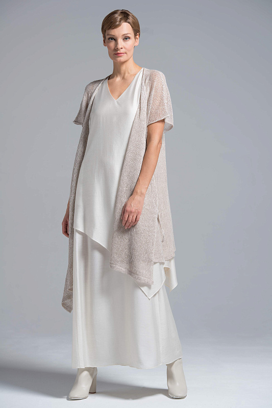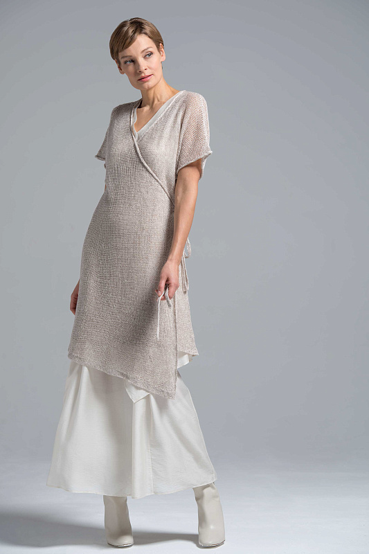 Оригинальный кардиган-замотайка А-силуэта, спущенная линия плеча, V-образный вырез горловины, асимметричная линия низа. Модель выполнена из итальянского льна высочайшего качества.