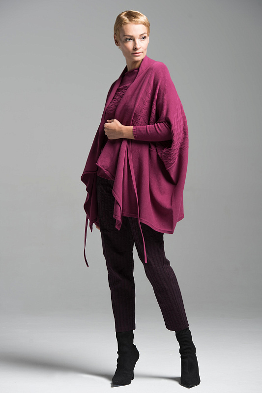 Накидка кейп, сложной дизайнерской конструкции, на завязках, прорези для рук обвязаны тонкой резинкой, объемный рисунок по полочке и по спинке. Кейп добавит таинственности и загадочности образу, к тому же ничего лучше для холодных дней, чем теплая вязаная накидка из итальянской вискозы, которая никогда не упадет с плеч.