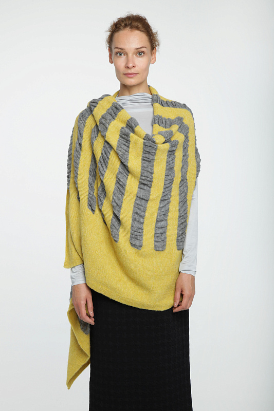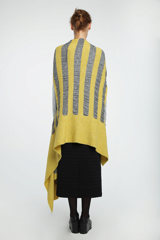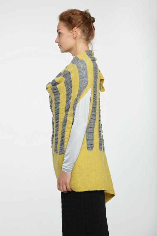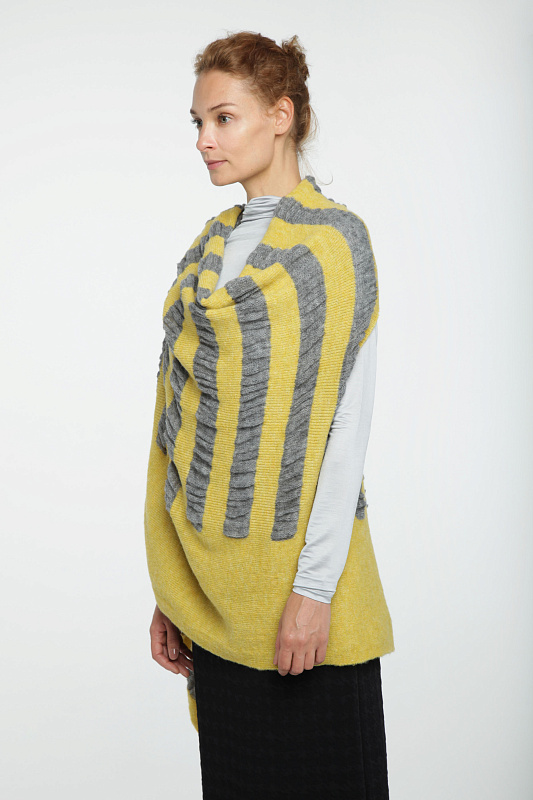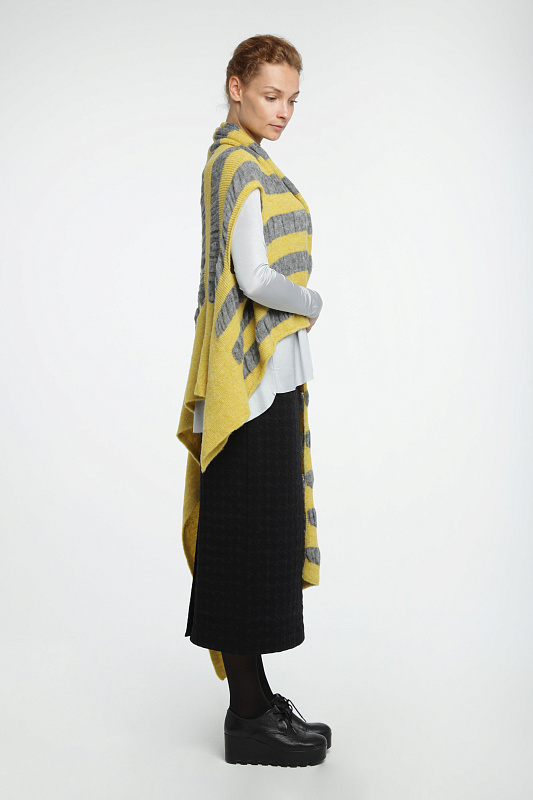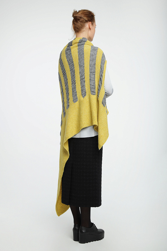 Жилет-накидка свободного фасона связан из меланжевой пряжи. Такой жилет является как самостоятельным предметом одежды, так и оригинальным аксессуаром. Многообразие вариантов носки - в этом его ценность.
