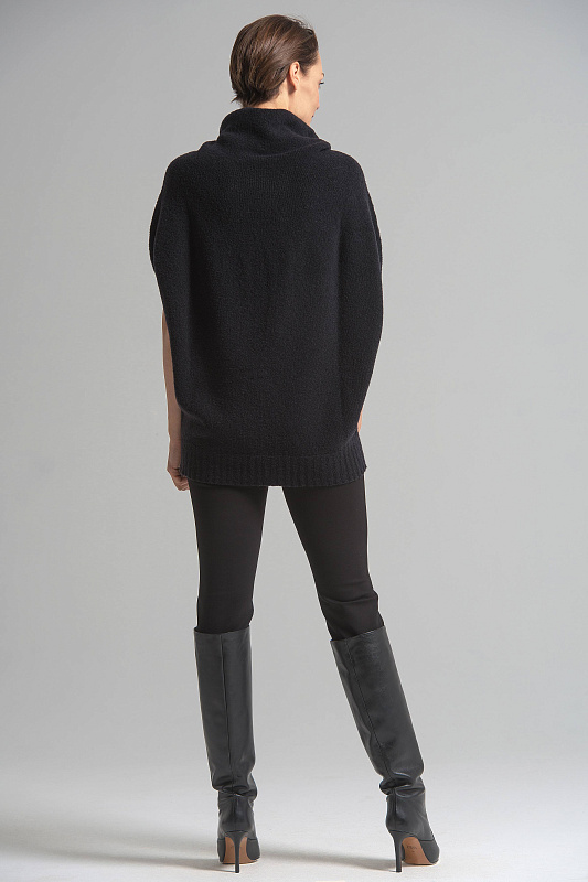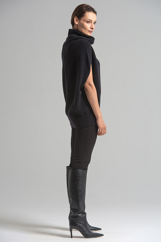 Мягкий и теплый жилет силуэта «ромб» из тонкой буклированной шерсти. Бесшовная технология вязания лицевой кулирной гладью. Спущенная линия плеча, широкий и объёмный воротник-хомут. Низ изделия — широкая резинка.