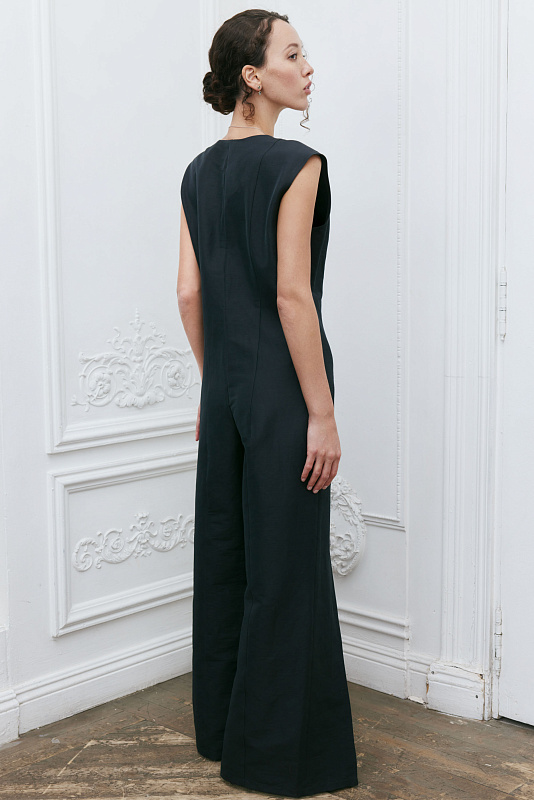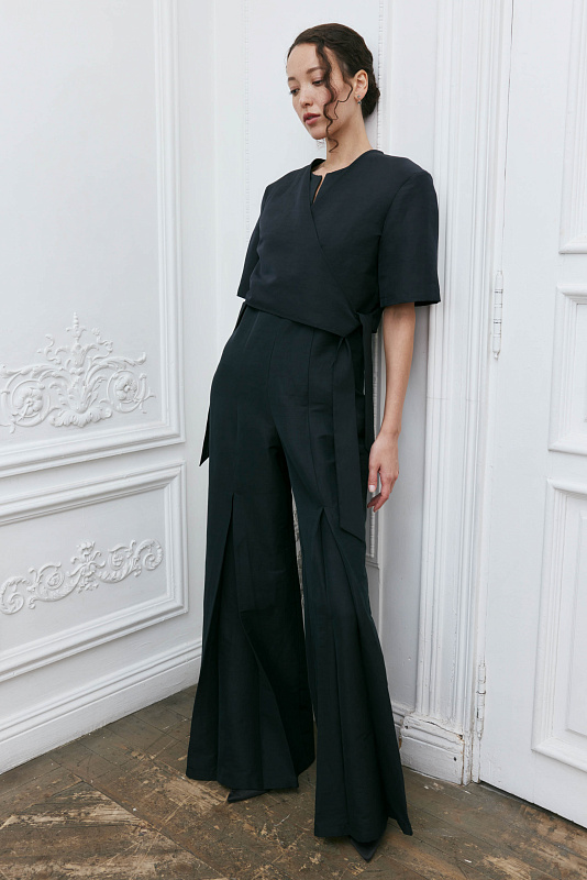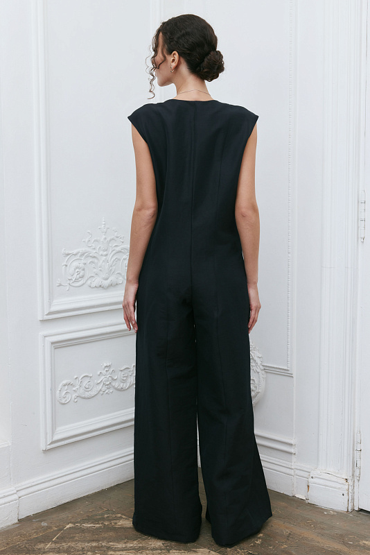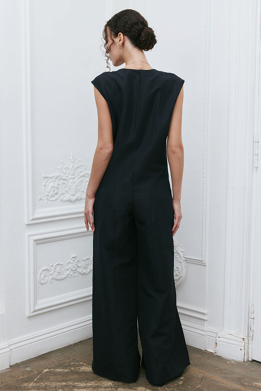 В каждом сантиметре этой модели — эстетика дизайнерского кроя. Прямой, немного свободный крой отвечает за комфорт. Застёжка-молния спереди пикантно замаскирована под шов. Две симметричные продольные строчки по переду и спинке вытягивают силуэт, делают его изящным. Открытые плечи притягивают взгляд к верхней части, а складка, выполненная из прозрачного материала, — к нижней части модели. Одна из главных особенностей этого комбинезона — прозрачная складка на брючине. Она добавляет образу лёгкости и воздушности, делая его женственным и романтичным. Сочетание льна и хлопка в одной ткани создаёт материал, который объединяет в себе лучшие свойства обоих волокон. 2% эластана — для комфортной, правильной посадки изделия. Интеллигентный, лёгкий блеск ткани придаёт изделию особый шарм. Комбинезон — изысканная вещь, которая станет основой для множества образов благодаря своему универсальному дизайну и в сочетании с различными аксессуарами. С моделью арт. 2825100 составляет идеальный комплект для торжественных случаев.