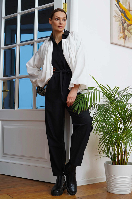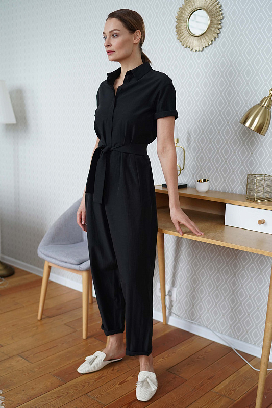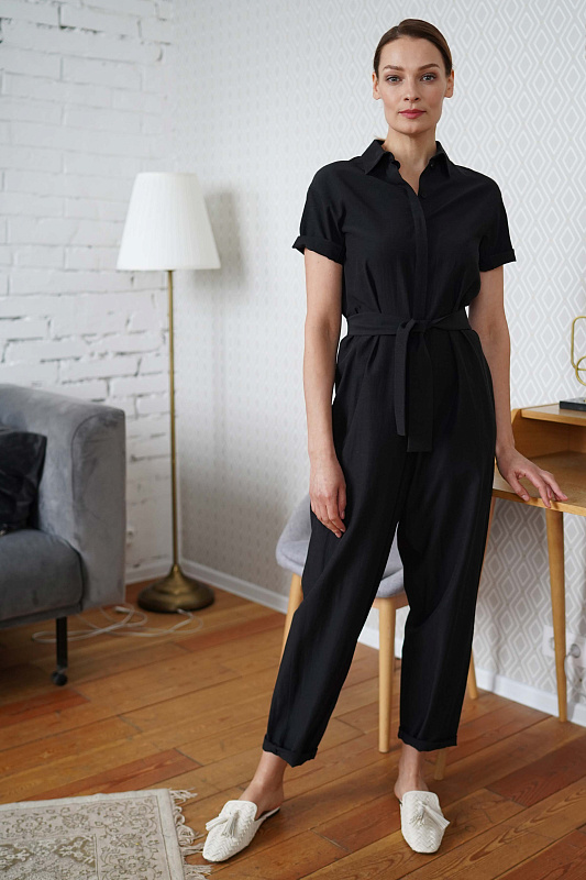 Комбинезон оригинальной дизайнерской конструкции с поясом, на скрытых пуговицах. Рубашечный воротник, спущенная линия плеча, прямая линия борта, карманы в шве, ластовица, переходящая в отрезной бочок. Изделие выполнено из мягкого формообразующего хлопка.