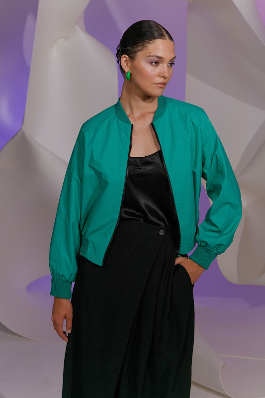 Трендовая куртка бомбер укороченного силуэта с вискозными подвязами. Застежка - молния. Модель на шелковистой вискозной подкладке.